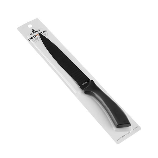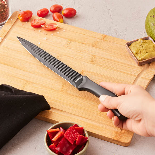 چاقوی برند معتبر کاراجا طرح MOMENTUM مخصوص برش لایه ای با تیغه غیر صاف و موجی شکل و رنگ ضدخش سیاه و هماهنگ با دسته مشکی ، بسیار خوش دست ، مخصوص آشپزخانه های شیک کدبانوهای مشکل پسند و حرفه ای است