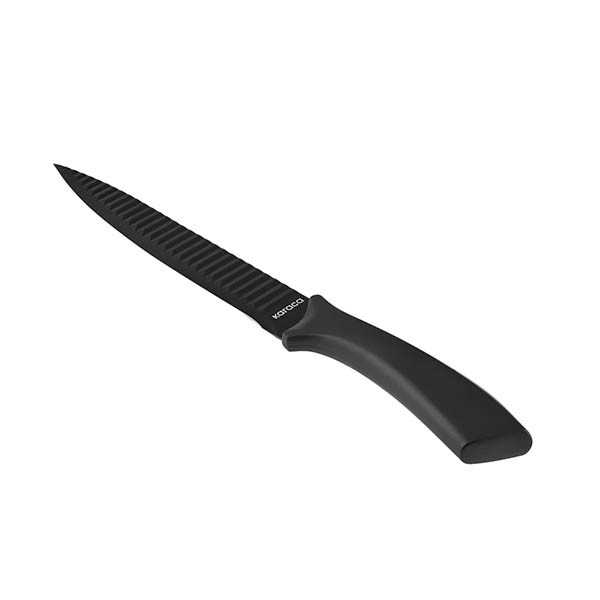 چاقوی برند معتبر کاراجا طرح MOMENTUM مخصوص برش لایه ای با تیغه غیر صاف و موجی شکل و رنگ ضدخش سیاه و هماهنگ با دسته مشکی ، بسیار خوش دست ، مخصوص آشپزخانه های شیک کدبانوهای مشکل پسند و حرفه ای است