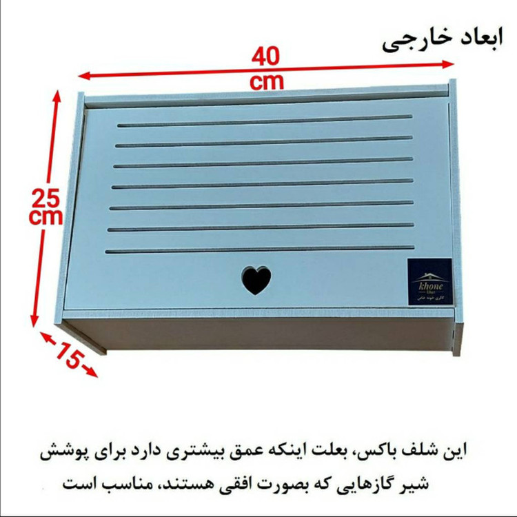 شیر های گاز در خانه ها معمولا روی دیوار چهره زیبایی ندارند و قرار دادن شلف دیواری خونه خاص جهت پوشش دادن شیر گاز می تواند جلوه زیبایی به خانه یا محل کار شما بدهد.این باکس با سایز بزرگ به گونه ای طراحی شده که با عمق زیادی که دارد لوله های گاز که بصورت افقی قرار دارند داخل آن به راحتی قرار می گیرد و باز و بسته می شود.