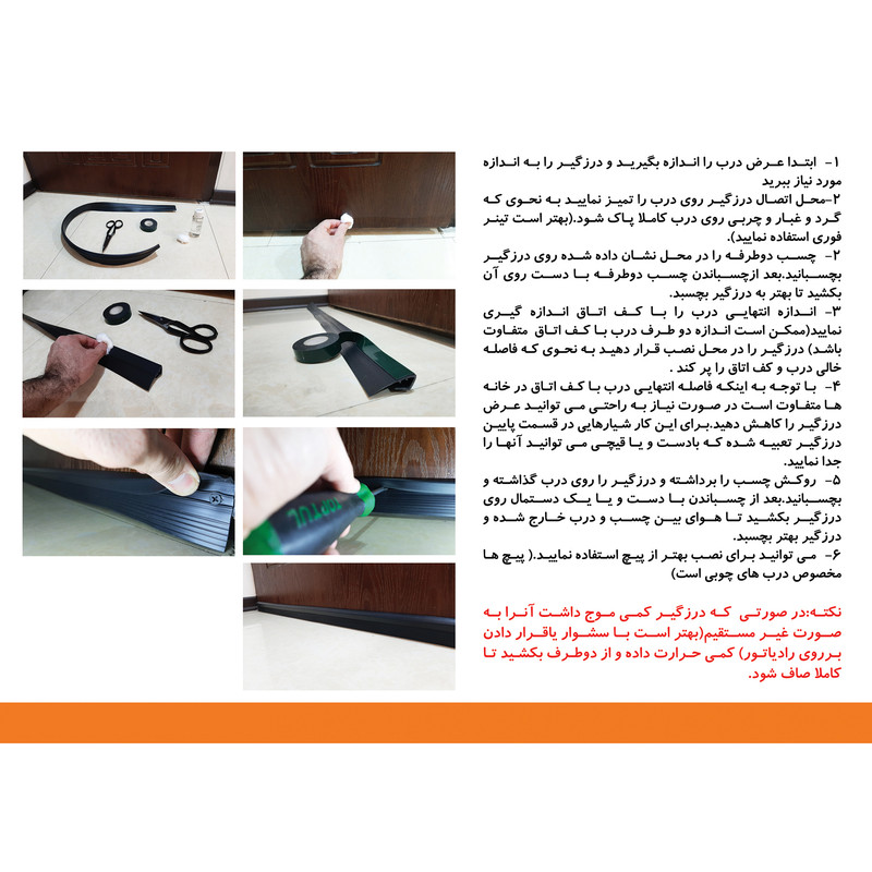 این محصول برای پوشاندن قسمت پایین درب های منزل(درب ورودی به منزل،درب اتاق خواب،درب بالکن،درب سرویس بهداشتی و حمام،اتاق های سرور) که فضای خالی زیر درب باعث ورود و خروج گرما و سرما در فصول مختلف میشود کاربرد دارد.