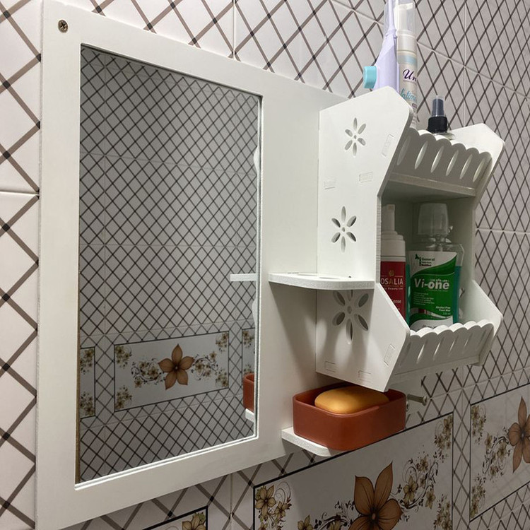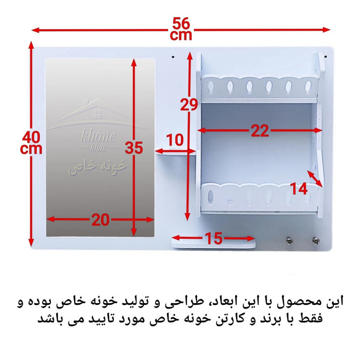آینه سرویس حمام مدل چند منظوره محصول ایرانی با طراحی و تولید خونه خاص بوده که از ورق درجه یک پی وی سی تهیه شده و مناسب سرویس بهداشتی می باشد این محصول دارای جای آویز حوله یا لیف، جای شامپو، جاصابون، جای ژیلت و ... می باشد و طراحی کامل و در عین حال ساده و شیک دارد که می تواند جلوه زیبایی به سرویس بهداشتی و حمام بدهد. جنس محصول کاملا قابل شستشو است و با خیال راحت در سرویس بهداشتی، مکان های مرطوب و حتی در تماس مسقیم با آب قابل استفاده می باشد و به هیچ عنوان خراب و پوسته پوسته نمی شود. طرح محصول ساده، شیک و پرطرفدار است. این محصول بصورت تک جعبه در کارتن خونه خاص تولید و ارسال می شود.