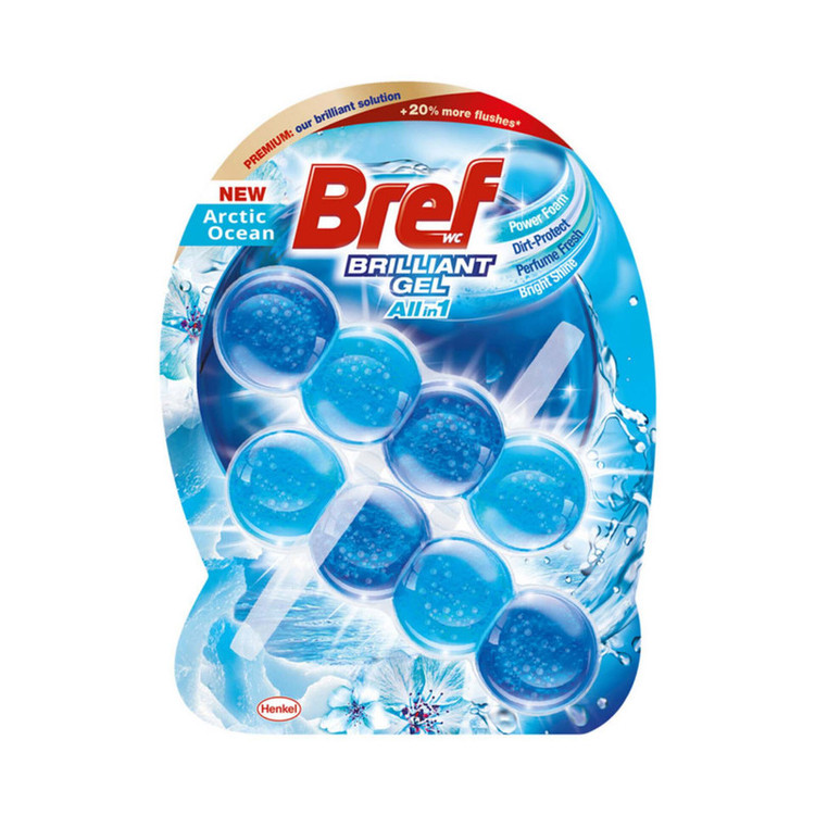 خوشبوکننده و ضدعفونیکننده توالتفرنگی Bref مدل Brilliant Gel با رایحه Arctic Ocean دارای 4 ویژگی بارز برگرفته از تکنولوژی Henkel آلمان میباشد این محصول ساخت کشور ترکیه است1- ضد عفونی کننده 2-رسوب گیر3-درخشان کننده 4 خوشبو کننده و با رایحه اقیانوس منجمد شمالی میباشد.این محصول یکی از جدیترین محصولات برف میباشد ومخصوص توالت فرنگی ونیز دارای خاصیت کف کنندگی جهت عملکردی بهتر برای هم پوشانی 4 ویژگی ذکر شده میباشد.. این محصول در بسته بندی 8 عددی عرضه می شود که ماندگاری طولانی مدت دارد.پس از هر بار استفاده از سیفون دستشویی، آب را روی قرص توپی برف bref ریخته و محیط را با رایحه اقیانوسی خوشبو می کند.