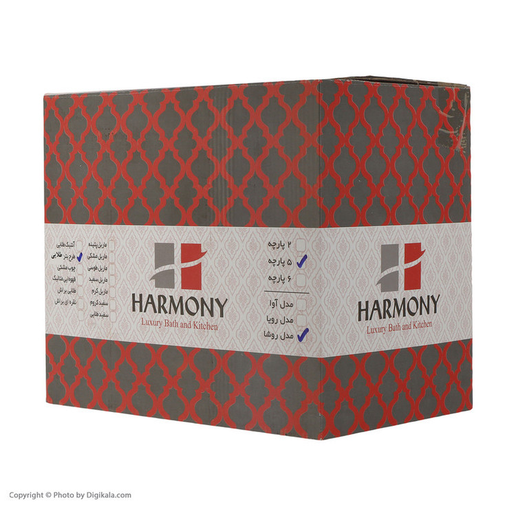 ست 5 پارچه هارمونی مدل روشا جدیدترین محصول شرکت هارمونی می باشد .که در دو رنگ بتنی طلایی(برای انتخاب این رنگ گزینه ی طلایی را انتخاب کنید)و بتنی طوسی کروم (برای انتخاب این رنگ گزینه ی کروم را انتخاب کنید).جنس این محصول از پلاستیک بسیار با کیفیت (ABS) و جدیدترین تکنولوژی آبکاری (آبکاری تحت خلا PVD) که کاملا مناسب محیط های مرطوب مثل سرویس بهداشتی و حمام می باشد.درب این محصول برای سهولت استفاده هم به صورت پدالی هم به صورت باد بزنی می باشد .برس این کار یک تکه با سری زبر و مقاومت بالا طراحی شده است.