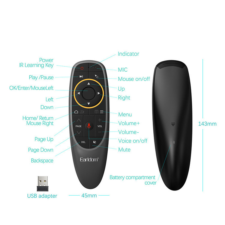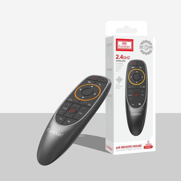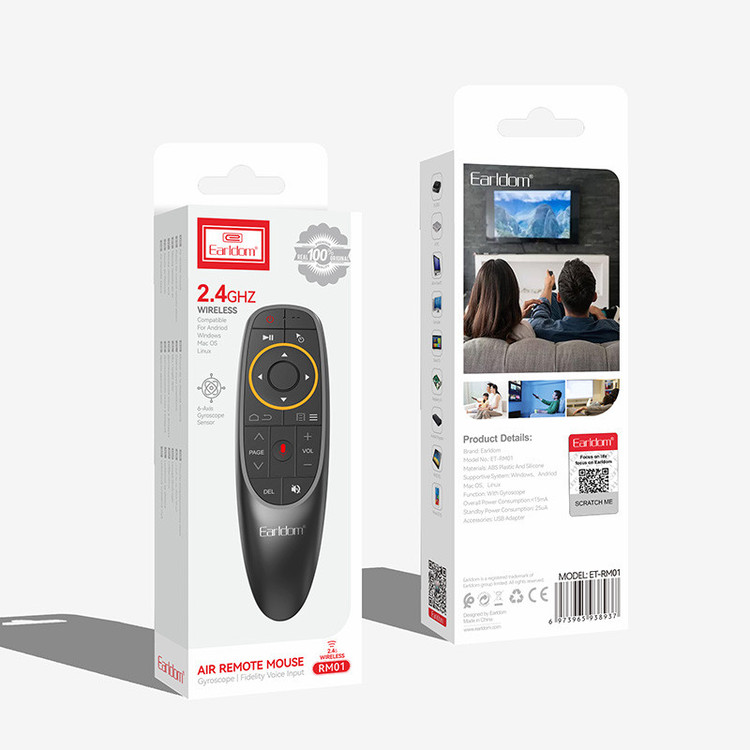 ریموت کنترل ایرماوس مدل ET-RM01، دارای ژیروسکوپ شش محوره كه با حركت دادن دست خود میتوانيد حركت ماوس را روی سيستم خود مشاهده كنيد، ميكروفون جهت جستجوي صوتي در وب است. این ایرماوس در دستگاههای اندروید باکس و لپ تاپ به راحتی با وصل کردن دانگل به دستگاه کار میکند. دقت کنید برای استفاده در انواع تلویزیونها با توجه به سیستم عاملهای مختلف، تمامی کلیدها پاسخگو نیستند و بستگی به نوع تلويزيون شما دارد. برای مثال در بعضی از مدلهای تلویزیون مانند سامسونگ كليدهای page up/down و كليد هوم كار نمیكنند