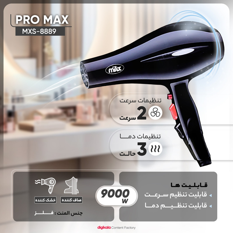 سشوار پرومکس مدل MXS-8889 یک ابزار بسیار کارآمد و کاربردی برای مراقبت از موها است. این دستگاه دارای ویژگیهای منحصر به فردی است که تجربه استفاده از آن را به یک سطح جدید ارتقا میدهد. سه حالت تنظیم دما و دو سرعت مختلف که امکان انتخاب انطباق بهتر با نیازهای شما را فراهم میکند. از جمله لوازم جانبی این سشوار، متمرکز کننده باریکاست که به شما کمک میکند تا موهای خود را بهراحتی و بهترین شکل ممکن حالت دهید. با وزن سبک زیر 700 گرم و توان مصرفی 9000 وات، این سشوار قدرتمند و کارآمد است. امکانات آن شامل تنظیم سرعت و دما، ابزار فرم دهنده مو و حلقه آویختن میباشد. همچنین، موتور AC قدرتمند آن مناسب استفاده نیمه حرفهای است و جنس المنت فلزی آن باعث افزائش عمر مفيد دستگاه میشود.