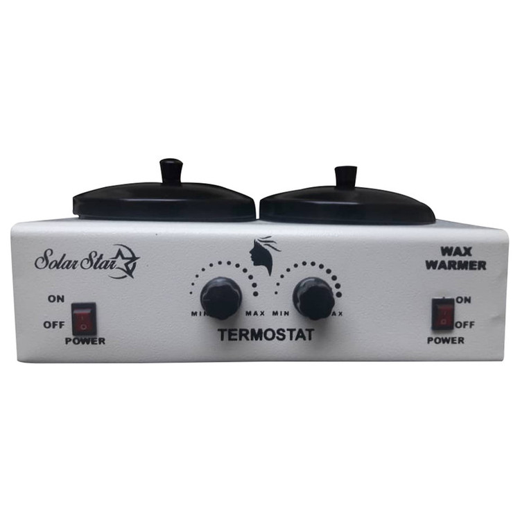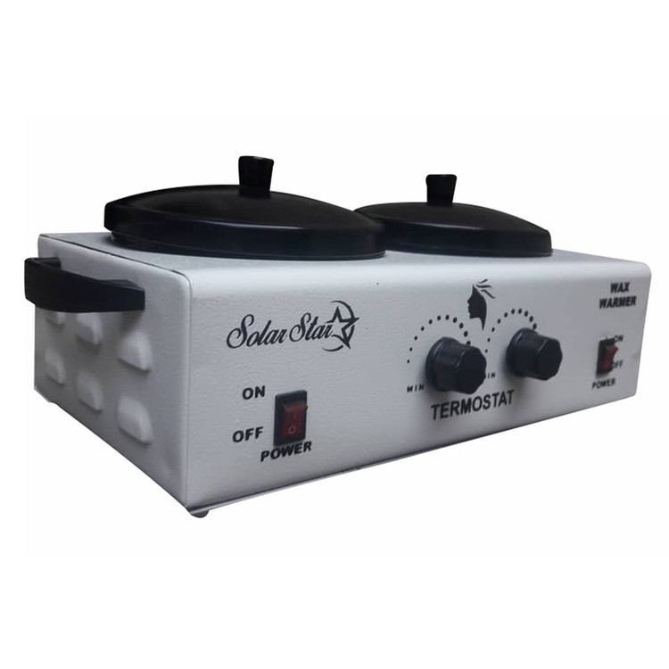 دستگاه وکس دوقابلمه ای سولار استار وسیله ای برای اپیلاسیون بدن وصورت هم برای آقایون و هم برای خانم ها مورد استفاده قرار میگیرد.این دستگاه برای ذوب و داغ کردن تمامی وکس ها(وکس فله .وکس قالبی .وکس سکه ای وکس عدسی..) کارایی دارد داشتن دو عدد قابلمه بیشتر برای اینکه بتوانیم در یکی از قابلمه هاکار ذوب کردن و دیگری برای نگهداری وکس ذوب شده دردمای مناسب و قابل استفاده میباشد همچنین داشتن دوق ابلمه برای زمانی که وکس زیادی برای مصرف نیازداریم بسیارمنسب است.یازمانی که دویاچندنفرمیخواهند همزمان اپیلاسیون انجام دهند کارایی بالایی دارد.طول این دستگاه 35 سانتی متر و عرض آن 25 سانت وارتفاع آن 14سانتی متر میباشد.دستگاه وکس سولار استار برای اینکه در مصرف انرژی برق صرفه جویی شودطوری طراحی شده که بتوانیم فقط ازیکی از قابلمه ها هم استفاده کنیم چون هر قابلمه دارای کلید روشن خاموش و ولوم دمای جدا از هم را دارد.