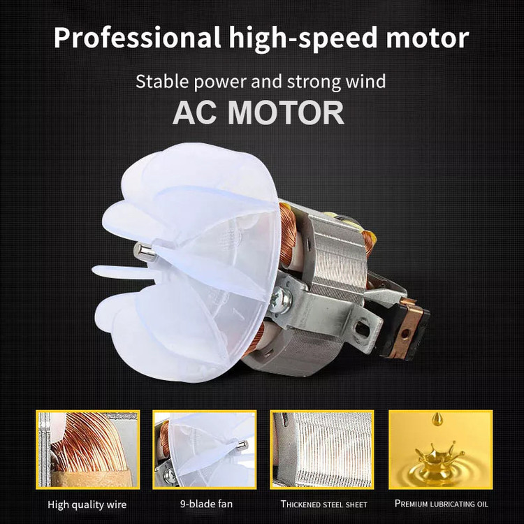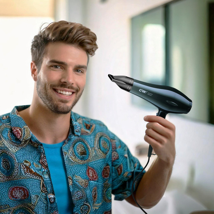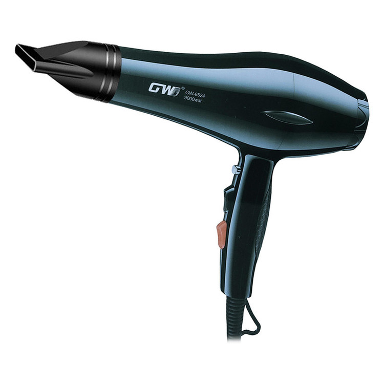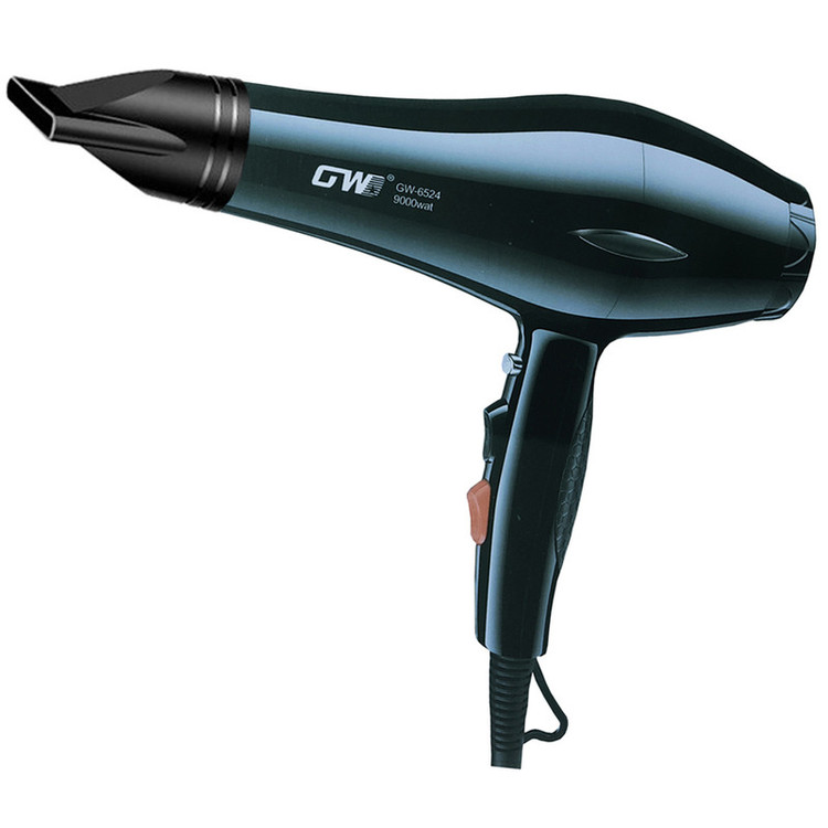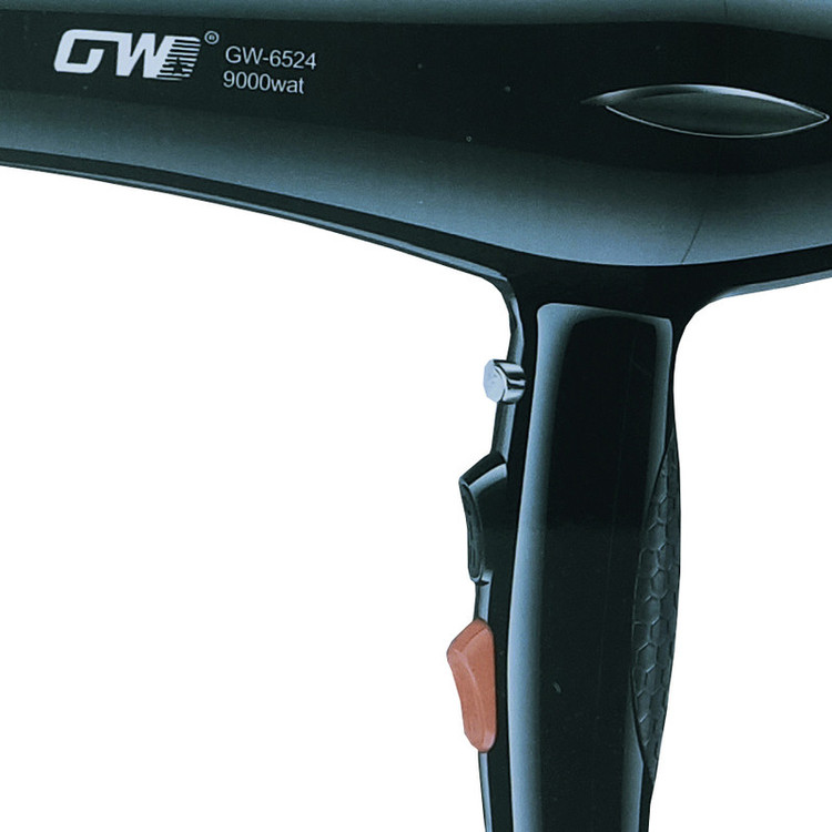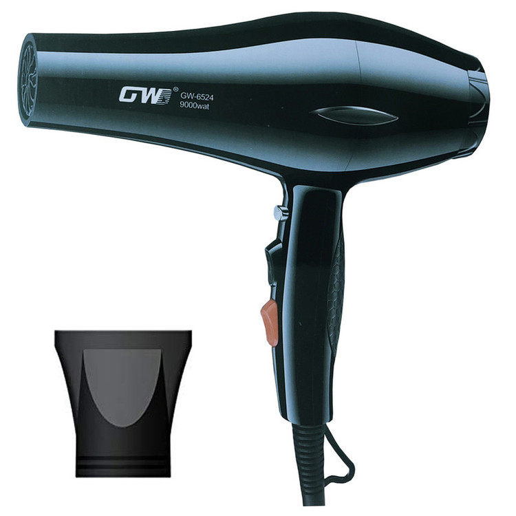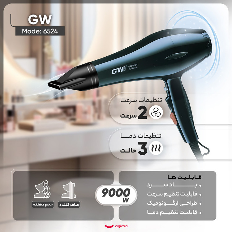 سشوار حرفه ای GW مجهز به موتور قدرتمند AC می باشد. این سشوار دارای قابلیت تنظیم 3 حالت دمای سرد ، گرم و داغ و همچنین قابلیت تنظیم دو حالت پرتاب باد می باشد. این محصول مجهز به دکمه باد سرد فوری (کول شات) است که با فشردن این دکمه بدون تغییر در تنظیمات به جریان باد سرد دسترسی خواهید داشت و با رها کردن این دکمه به تنظیمات حرارت قبل باز خواهید گشت. سیم بلند این سشوار به طول 1.70 متر امکان آزادی عمل بیشتری به شما خواهد داد و بعد از اتمام کار می توانید به کمک حلقه تعبیه شده در انتهای دسته، سشوار را در جای مخصوص خود آویزان کنید. همراه این محصول سری متمرکز کننده جریان باد نیز دریافت خواهید کرد.