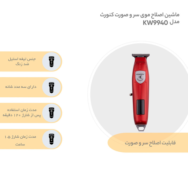 ماشین اصلاح موی سر و صورت کنورث مدل KW9940 محصولی از شرکت کنورث (Kenworth) است که برای اصلاح موهای سر و صورت و استفاده ارایشگران طراحی شده است. این مدل دارای تیغههایی از جنس استیل ضد زنگ است که دقت بسیار بالایی دارد و در مدت زمان کوتاهی پوستی صاف و بدون مو را بدون ایجاد هر گونه حساسیت و سوزش به شما هدیه میدهد. ماشین اصلاح موی سر و صورت کنورث مدل KW9940 مانند دیگر محصولات این برند دارای نمایشگر LCD اشت که درصد شارژ را نشان میدهد و با کابل USB آن دیگر نگرانی بابت اتمام شارژ آن ندارید و در هر مکانی میتوانید آن را شارژ کنید. اقلام همراه ماشین اصلاح موی سر و صورت کنورث مدل KW9940 شامل برس تمیز کننده، بطری روغن، کابل یو اس بی و سه شانه تنظیم کننده کاتر در سایز های نیم، یک و دو است. مدت زمان لازم برای شارژ کامل ماشین اصلاح موی سر و صورت کنورث مدل KW9940 نود دقیقه است که پس از ان 120 دقیقه بی وقفه کار میکند.