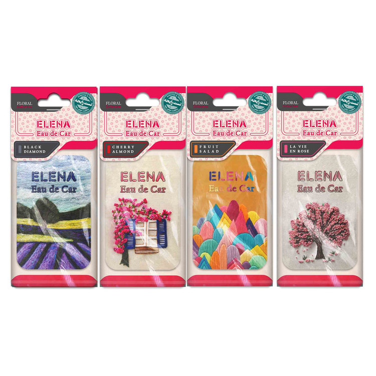این مجموعه شامل 4 عدد خوشبو کننده کارتی النا سری FLORAL می باشد. رایحه ی این 4 خوشبوکننده با یکدیگر متمایز بوده و شامل روایح زیر می باشد: 1- بادام آلبالو 2- سالاد میوه 3- الماس سیاه 4- زندگی صورتی