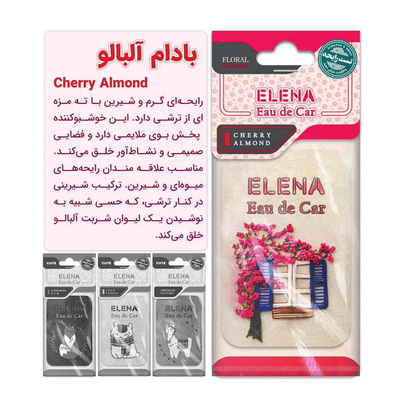 این مجموعه شامل 4 عدد خوشبو کننده کارتی النا سری FLORAL می باشد. رایحه ی این 4 خوشبوکننده با یکدیگر متمایز بوده و شامل روایح زیر می باشد: 1- بادام آلبالو 2- سالاد میوه 3- الماس سیاه 4- زندگی صورتی