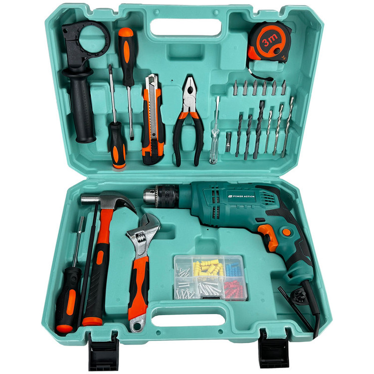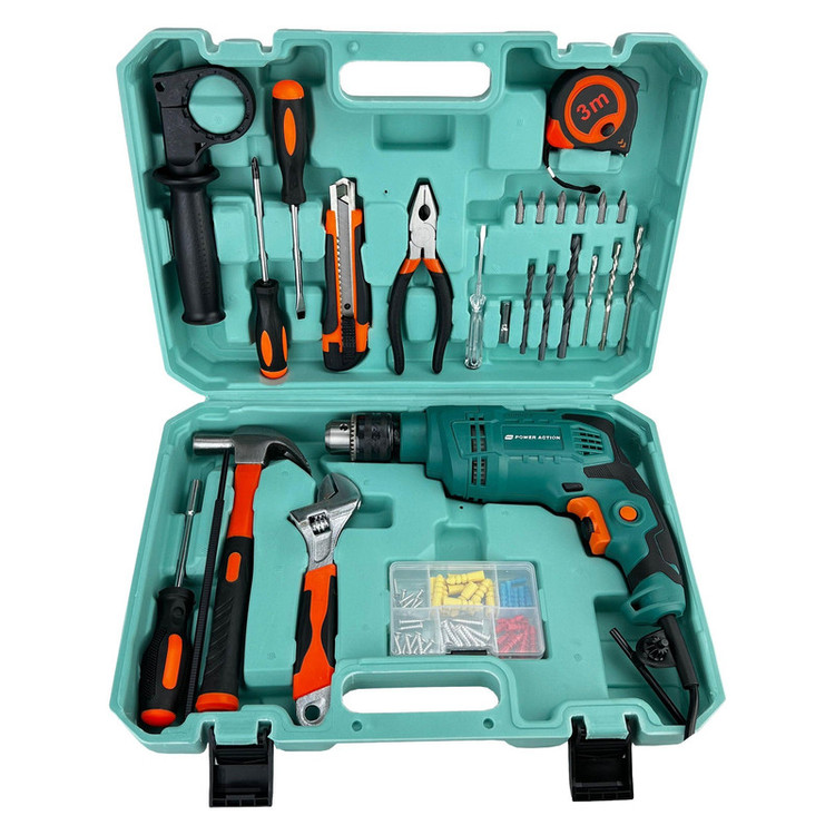 مجموع ابزار و دریل چکشی پاور اکشن مدل ID 750-B مثل همهی دستگاههای الکتریکی دیگر، موتور را میتوان مهمترین قسمت یک دریل معرفی کرد. این بخش تعیین کنندهی قدرت و سرعت یک دریل است که دریل POWER ACTION با داشتن توانی معادل 750 وات واقعی، امکان فراهم کردن دورموتوری معادل 2800 دوردردقیقه درحالت آزاد و امکان دریل کاری چکشی قدرتی و ایجاد حفره در انواع سطح چوب، آهن و بتن گزینه مناسبی برای دریل در رنج قدرتی متوسط به بالا میباشد. شرکت پاور اکشن به دلیل استفاده از متخصصین زبده و همچنین رعایت بالاترین استانداردهای تولید توانسته است محصولاتی با کیفیت عالی و قیمتی رقابتی تولید نماید. این دریل پاور اکشن مجهز به دستهی کمکی گردان 360درجه و عمق سنج است. دریلهای برقی انرژی موردنیاز خود را مستقیما از طریق جریان برق تأمین میکنند. این دریلها عموما از قدرت بیشتری نسبت به دریلهای شارژی برخوردارند و با استفاده از آنها کاربر نگرانی از جهت اتمام باتری دستگاه نخواهد داشت. دریل چکشی پاور اکشن دارای سیستم چپگرد -راستگرد و 2 حالت مته و چکشی است، همچنین قفل سوییچ برای استفاده طولانی مدت از دستگاه و با دیمری که تعبیه شده با سرعتهای مختلف کارکرد را برای کاربر راحت میسازد. جنس سیم کشی تماما مسی بوده و باعث عمر مفید و بیشتر دستگاه میشود، این دستگاه با وزن کم و خوشدست بودن و دستهی ضد لرزش آن میتوان زمان بیشتری را با آن کارکرد. مجموعه 28 عددی پاور اکشن مدل ID 750-B مجموعهای کامل از ابزارآلات ضروری و مورد نیاز دستی و دریل چکشی است که اکثر نیازهای شما را جهت استفاده در خانه ، خودرو ، اداره و مشاغل صنعتی و تعمیراتی تامین خواهد کرد.