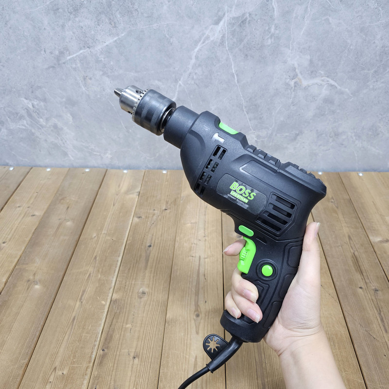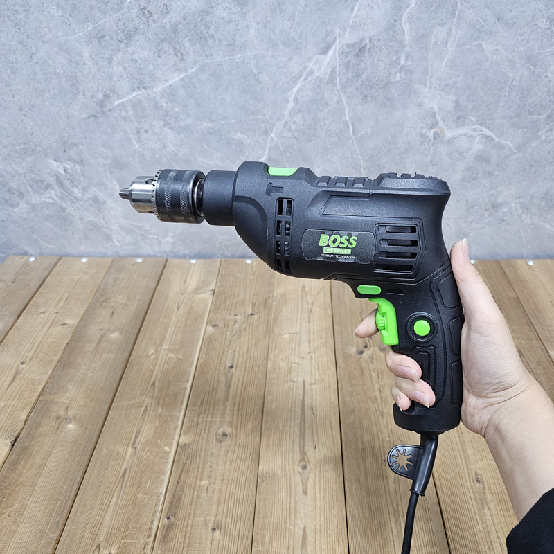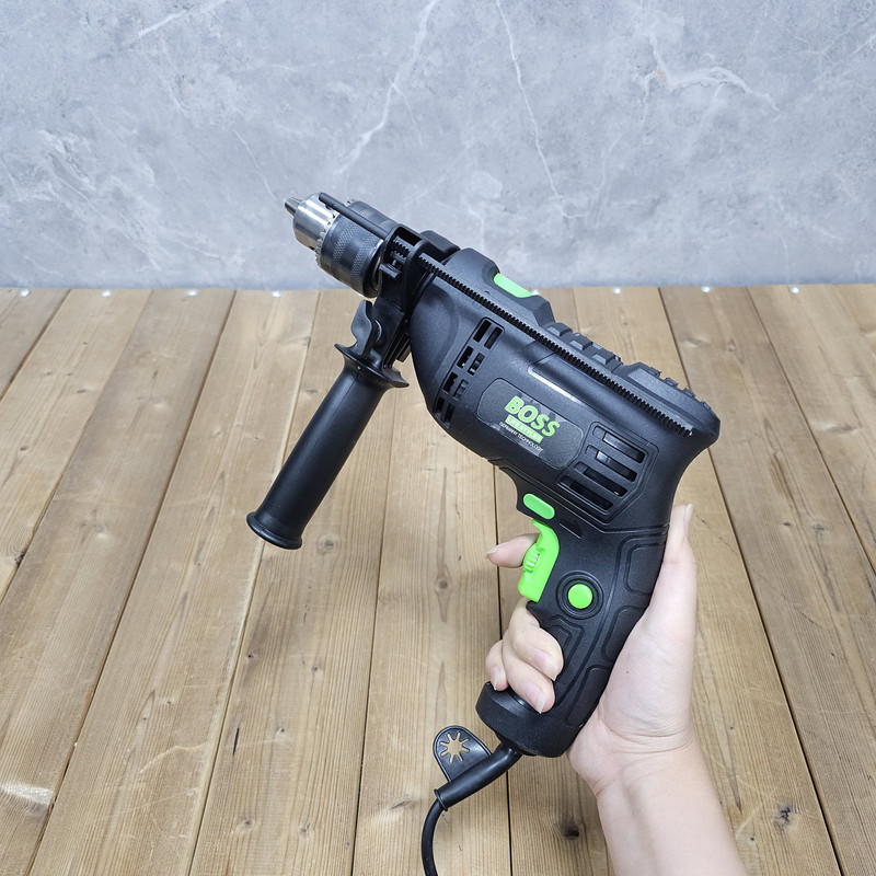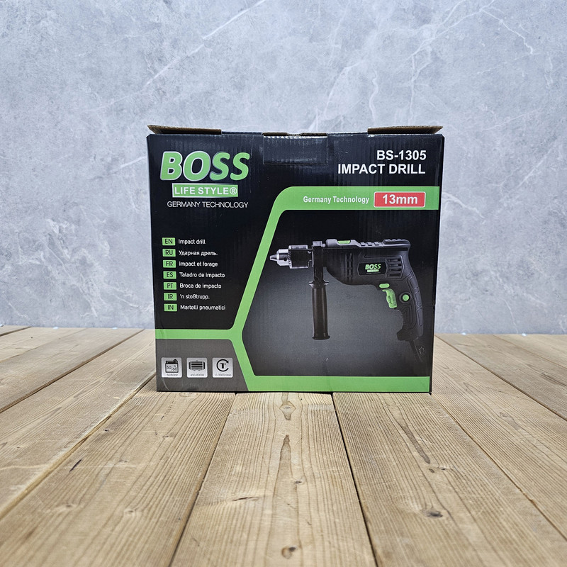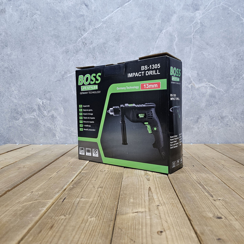 دریل چکشی باس مدل LIFE_STYLE کد BS1305 که یکی از انواع ابزار های برقی دریل هستند که از آنها برای سوراخ کاری و پیچکاری استفاده می شود. مکانیزم کار در این ابزار به گونه ای است که از طریق چرخش مته در سرعت بالا می توان سوراخ کاری را انجام داد. دریل چکشی در اصل یکی از انواع دریل ها هستند که کاربرد وسیع تری نسبت به دریل های معمولی دارد و از آنها می توان در سوراخ کاری سطوح سخت و بتنی و گچی و سنگ و سرامیک و ... استفاده کرد. دریل باس علاوه بر قابلیت سوراخ کاری به صورت چکشی با قطر و عمق بیشتر، در سوراخ کاری بتن و مصالح ساختمانی کاربرد بیشتری دارد، همچنین قابلیت پیچ کاری، به خصوص پیچهای خودکار MDF و چوب را هم داراست. یکی دیگر از از دیگر مزایای این دستگاه قابلیت استفاده بجای آچار بکس در صورت مهیا بودن تبدیل بکس و سبک بودن کار است. با وجود اینکه قابلیت دریل در سوراخ کاری بالاتر است اما دریل باس به دلیل سرعت بالاتر و همچنین تمرکز نیرو برای سوراخ کاریهای دقیقتر و کیفیت سطوح بالاتر، گزینه مناسبتری است. دریل BOSS ابزاری است الکتریکی، که برای سوراخ کردن سطوح به کار میرود. دریل را با توجه به قدرت آن و نیز با استفاده از مَتّه مناسب، می توان برای سوراخ کردن چوب، فلز و بتن به کار برد. با پیشرفت ابزارها، امروزه نه تنها برای سوراخکاری، بلکه با اضافه کردن قطعاتی دیگر، میتوان امکاناتی مانند ساییدن، گردبر، عمودبر و… را هم به این دستگاه اضافه کرد. این دریل برای کارهای خانگی ، کارگاهی،تعمیرگاهی،ساختمانی و نصب و مونتاژ استفاده می شود.