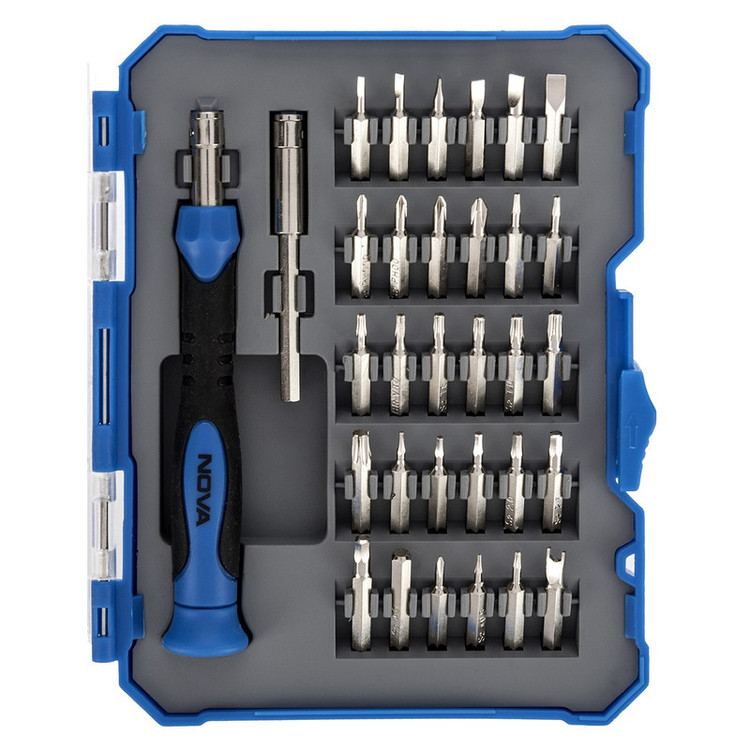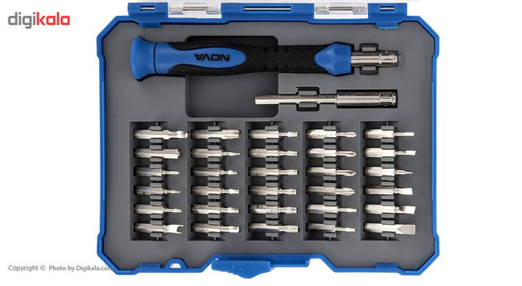 وجود یک مجموعه ابزار در کارگاه یا حتی منزل شما باعث میشود تا کارها بسیار راحتتر و دقیقتر انجام شوند. در بازار انواع مختلفی از پیچ با کاربردهای متفاوت وجود دارند. گل پیچها بهصورت دوسو، چهارسو، ستارهای و غیره است. برای باز و بسته کردن پیچها به ابزار مخصوصی نیازمندیم. چنانچه نوع پیچها با هم متفاوت باشند، برای باز و بسته کردن آنها نیازمند تعویض ابزار هستیم. محصولی را که در بالا مشاهده میکنید، مجموعه 32 عددی سری پیچ گوشتی (Nova) «نووا» نام دارد که با مدل (NTS 1328) به بازار عرضه شده است. این محصول برای رفع تعویض ابزار در اختیار کاربران قرار گرفته است. این مجموعه با دربر داشتن انواع سریهای پیچگوشتی دوسو، چهارسو و ستارهای بهشما کمک میکند تا قادر به باز و بستهکردن هر نوع پیچی باشید؛ همچنین یک سری پیچ گوشتی سهپر در سایز Y2 و یک سری پیچ گوشتی رینگی کوچک در سایز U2.5 نیز در این مجموعه مو جود است. جنس سریها از آلیاژ استیل S2 بوده و همگی بههمراه دستهی پیچ گوشتی مخصوص در کاوری پلاستیکی نگهداری میشوند.
