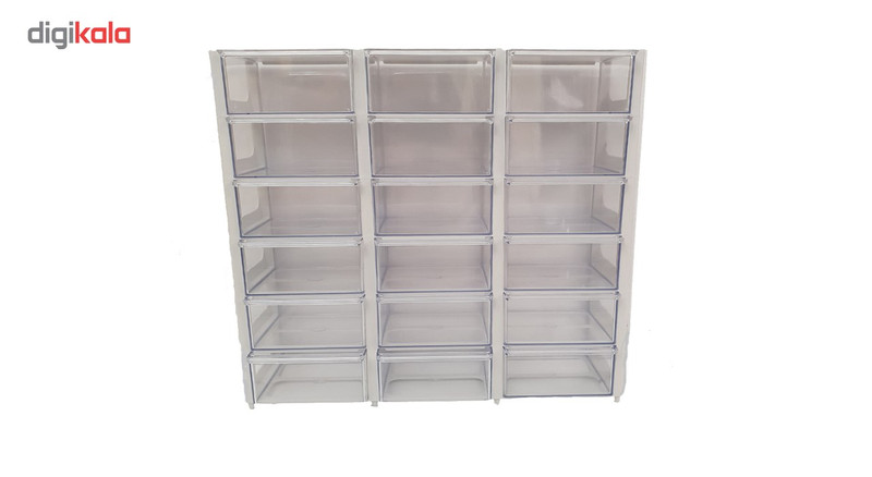 جعبه ابزار 18 کشو کریستالی که در 6 طبقه ساخته شده است از جعبه ابزارها یا جعبه قطعات های چند منظوره به حساب می آید.هر کشو از این جعبه به صورت شفاف و کریستالی میباشد به همین دلیل در تشخیص قطعات داخل هر کشو بسیار موثر است.هر کشو دارای لبه کوچکی است تا بوسیله این لبه کشو ها را عقب و جلو کرد.ناگفته نماند که کشو ها بسیار روان عقب و جلو میشوند.ابعاد کشو ها 10×10×6 سانتی متر میباشد و فضای کافی برای انواع قعات، ابزار،وسایل را دارد.ویژگی عالی این جعبه ابزار یا جعبه قعات دارد اینست که محدود به یکسری از اجناس نمیشود و برای تمامی مشاغل کاربردی ایست.برای مثال میتوانید قطعات کارگاهی،ابزار آلات،اسباب بازی،طبقه بندی خشکبار،وسائل کمکهای اولیه،نمونه های معرفی محصولات... در این جعبه ابزار قرار داد و از آنجاییکه میتوانید در کشو ها لیبل گذاری کنید ،این جعبه ابزار کمک بسزایی در مرتب کردن و نظم دادن وسایل شما میشود.جنس بدنه جعبه ابزار از نوع پلاستیک باکیفیت و جنس کشوها به صورت کریستالی میباشد