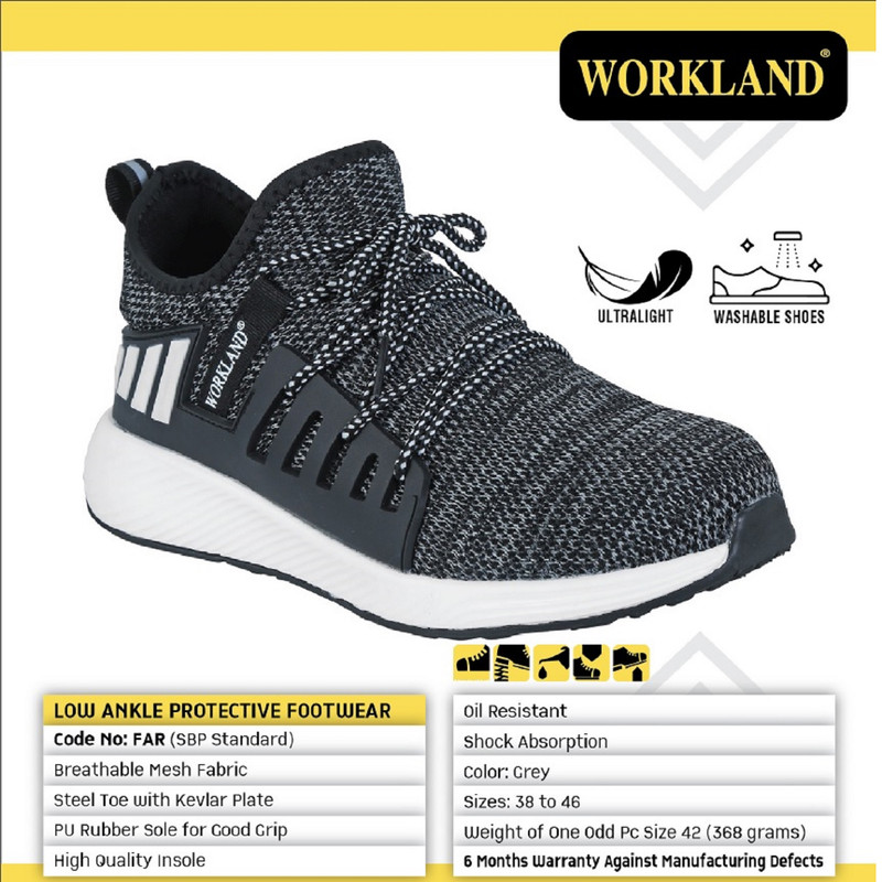 این مدل کفش متعلق به برند WORKLAND تولید شده در کشور چین می باشد . وزن این کفش آن نسبتا سبک بود و هر لنگه آن ( سایز 42 ) 520گرم وزن دارد . طراحی آن بسیار اسپرت و ظریف بوده و اصلا در نگاه اول کفش ایمنی بنظر نمی رسد . جنس رویه آن ترکیبی از پارچه بافت مش تنفس پذیر با قابلیت شستشو و با طراحی بسیار زیبا و چشمگیر می باشد . سرپنجه این کفش از جنس فولاد است . زیره کفش از جنس PU و لاستیک , آنتی شوک ( SHOCK ABSORPTION جاذب ضربه ) در قسمت پاشنه پا و ضد لغزش بوده و منعطف و همچنین مقاوم در برابر روغن و مشتقات نفتی می باشد .