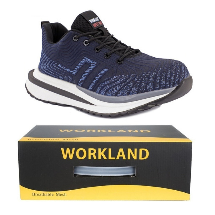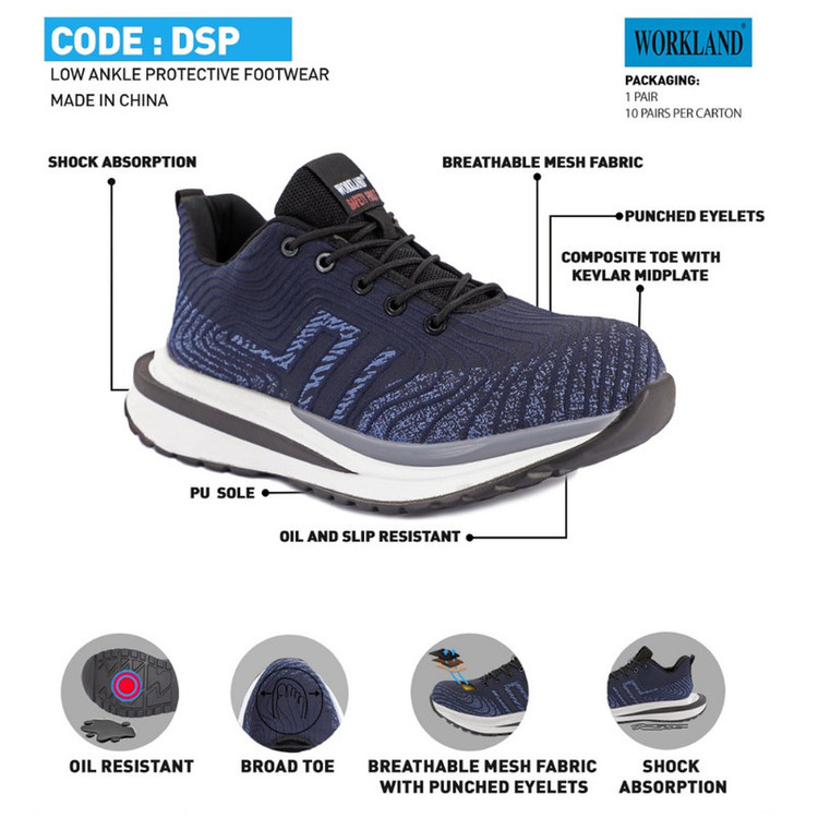 این کفش از برند WORKLAND تولید شده در کشور چین می باشد . وزن این کفش نسبتا سبک بود و هر لنگه آن ( سایز 43 ) تنها 490 گرم وزن دارد . طراحی ان بسیار اسپرت و ظریف بوده و اصلا در ظاهر کفش ایمنی بنظر نمی رسد . جنس رویه آن ترکیبی از پارچه بافت مش تنفس پذیر با طراحی بسیار زیبا و چشمگیر می باشد . سرپنجه این کفش از جنس کامپوزیت است . زیره کفش از جنس PU , آنتی شوک و ضد لغزش بوده و دارای خاصیت انعطاف پذیری بسیار خوبی می باشد . پاشنه کفش بصورت SHOCK ABSORPTIONطراحی شده است با توجه به اینکه در این کفش هیچ گونه فلزی به کار نرفته است ، می تواند برای در برابر جریانم برق فشار ضعیف تا 380 ولت ، عایق مناسبی می تواند باشد .