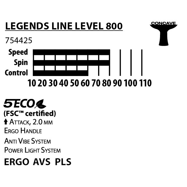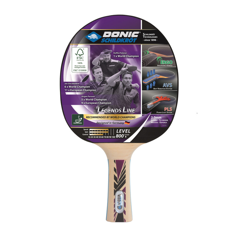 راکت پینگ پنگ دونیک شیلدکروت (Donic schildkrot) سری Legends line 800 یک راکت عالی برای کسانی که قصد یادگیری پیشترفته ورزش پینگ پنگ را دارند میباشد.فنآوریهای بزرگی در این راکت تعبیه شده است: PLS) Power Light System) دسته توخالی ویژه است که راکت را سبک و آسان میکند، در حالی که مرکز ثقل را به سمت سر راکت میبرد تا راکتی بسیار سنگین و تهاجمیتر داشته باشد. سیستم ضد ارتعاش AVS به طور قابل توجهی لرزش راکت را کاهش می دهد و بازی بدون خستگی را امکان پذیر می کند. لبه های گرد دستگیره ERGO در دست گرفتن بسیار راحت تر است و هیچ نقطه فشاری به دست ایجاد نمی کند. با داشتن این راکت فوق العاده لذت بیشتری از بازی خود میبرید.ضمنا راکت از چوب دارای گواهی FSC ساخته شده اند که این چوب از مدیریت پایدار جنگل به دست می آید و نه از بهره برداری بیش از حد. تمامی اطلاعات سرعت و پیچ و کنترل راکت در عکس انتهایی قابل مشاهده میباشد.