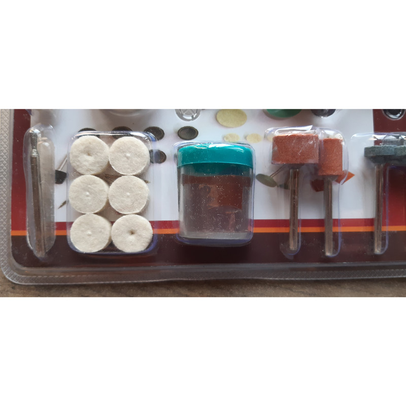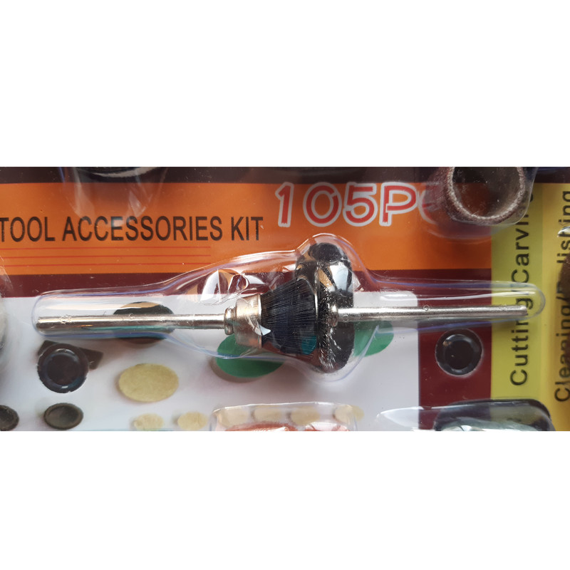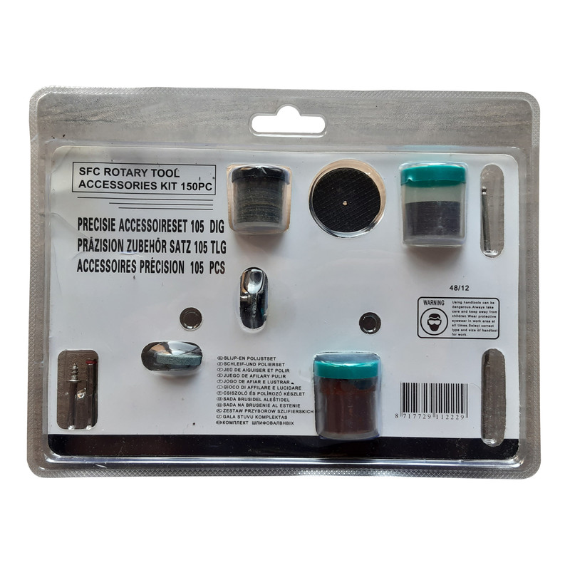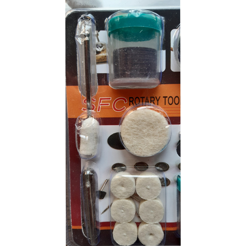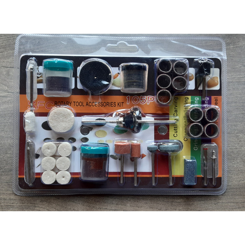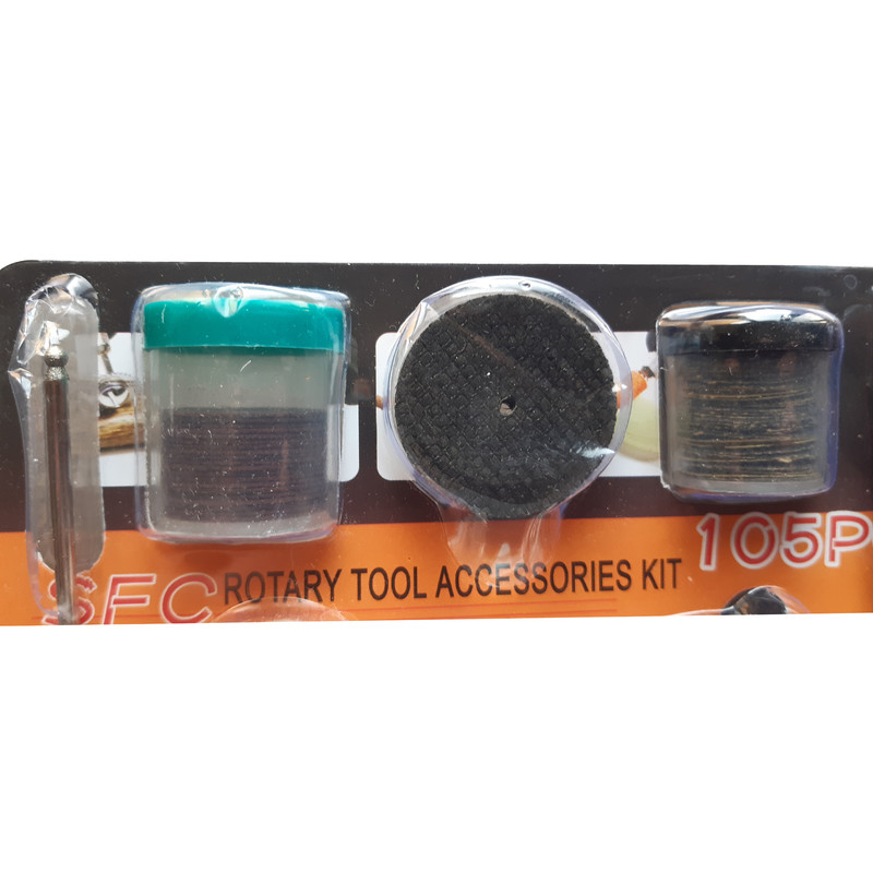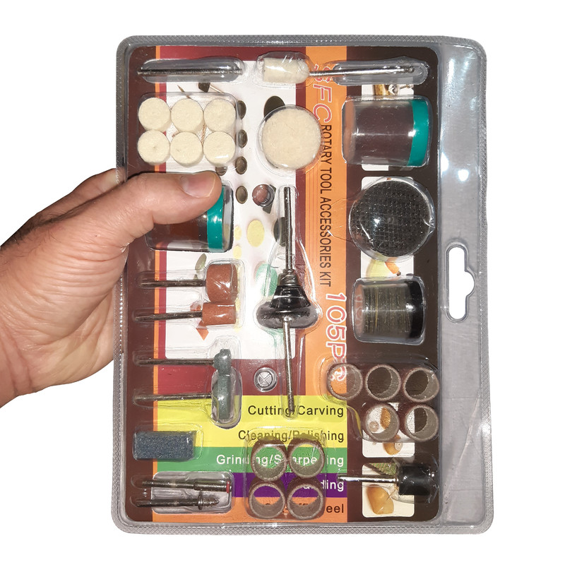 محصول فوق دارای 105 عدد ابزار متنوع جهت نصب بر روی فرز انگشتی جهت کارهای مختلفی همچون تمیزکاری ، سمباده زنی و پولیش کاری میباشد. از ابزارهای موجود در آن میتوان به سمباده حلقوی بعلاوه دنباله آن ( 9 + 1 عدد ) ، سنگ انگشتی (4 عدد ) ، نمد پولیش کاری ( 8 عدد ) ، فرز انگشتی الماسه پودری ( 2عدد ) فرچه سیمی پرداخت و نایلون غبار زدایی ( 2 عدد ) و دنباله های مربوطه مجموعا حدود 30 عدد و تعدادی صفحه برش فیبری ( حدود 75 ) عدد اشاره کرد که همگی آنها یا دارای دنباله 3 میلی متر بوده و یا به دنباله های 3 میلیمتری موجود در این مجموعه متصل میشوند. این محصول ، مجموعه کاملی را برای کسانی که مایلند کارهای فنی مورد نیازشان را به صورت محدود در خانه یا کارگاهشان ، شخصا انجام دهند فراهم میکند. در این مجموعه برای کاهش قیمت از ارائه جعبه مخصوص نگه داری ابزارها صرف نظر شده است و فقط جهت صفحات فیبری آن قوطی مخصوص تعبیه شده است که این امر کار را برای نگه داری سایر قطعات این مجموعه کمی مشکل میکند.