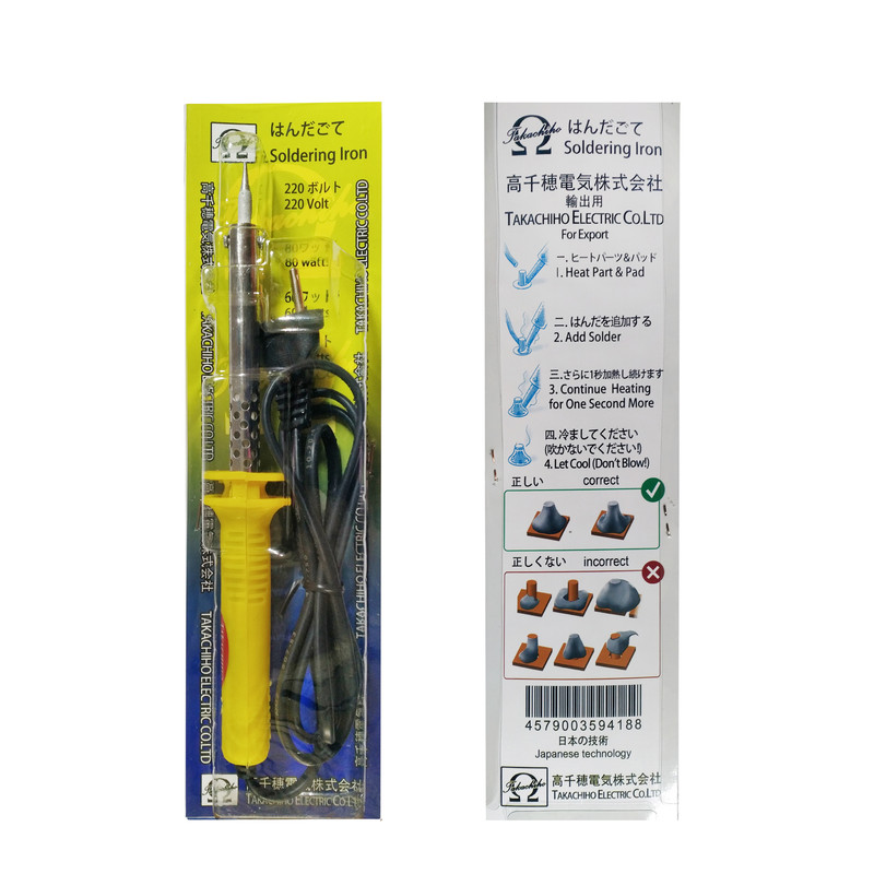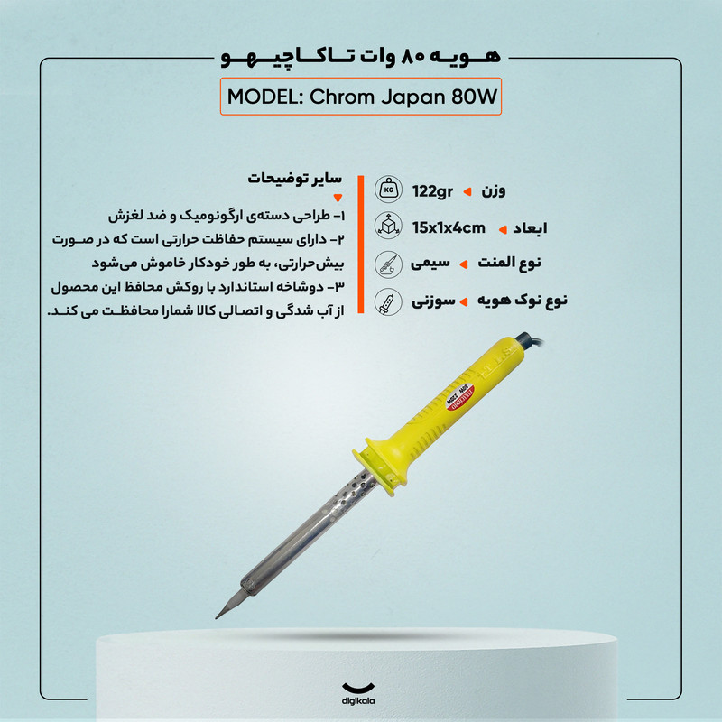 برند ژاپنی تاکاچیهو (TAKACHIHO) یک هولدینگ بزرگ در زمینه تولید وسایل الکترونیک می باشد که با سابقه و تجربه درخشان نزدیک به یک قرن در حال فعالیت است. هویه 80 وات تاکاچیهو از نظر گرمایشی در رده بالا هویه ها قرار دارد و دو مدل 40 وات و 60 وات دیگر نیز قابل تهیه است. نسبت به نیاز خود میتوان از وات های مختلف این محصول استفاده کرد.نوک سه لایه مخروطی شکل با سه پوشش: جنس مغزی نوک از فلز مس (جهت انتقال سریع و یکنواخت حرارت از المنت به نوک) ، جنس روکش بدنه نوک از کروم (جهت حفظ حرارت و جلوگیری از اتلاف انرژی و مصرف برق بهینه) و جنس مخروط نوک آبکاری شده با آهن متراکم (جهت آب شدن سریع لحیم ، عمر طولانی، عدم خوردگی و سائیدگی در دراز مدت).