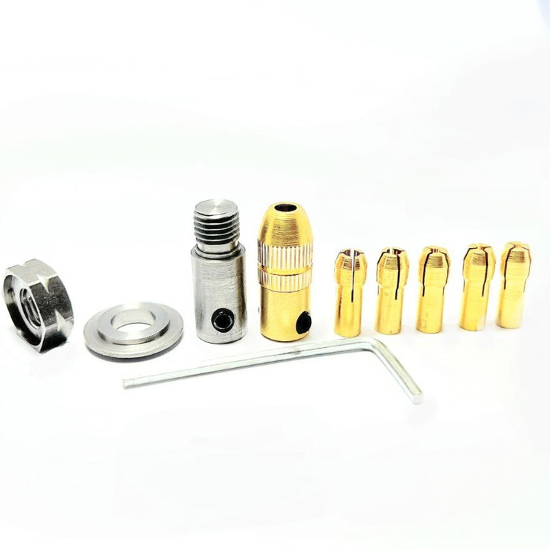 مجموعه سه نظام مینیاتوری شفت 3.2دارای پنج کولت مینیاتوری با سایز های 0.5 الی 3 میلیمتر برای سوراخکاری و مبدل فرز اره ای مینیاتوری قطعه ای رابط برای اتصال به موتور الکتریکی با شفت 3.2ساخته شده است . فرز بند قابلیت نصب انواع فرز های اره ای با ابعاد سوراخ 8 و 10و 13 را دارد . برای اتصال تیغ فرز اره ای و یا سنگ سنباده و … بر روی موتور ها به قطعات واسط احتیاج دارید . این قطعه به همین منظور طراحی و تولید شده و طرز کار به این صورت است از یک سمت با استفاده از ( پیچ آلن مغزی و آچار آلن ) که داخل بسته بندی قرار دارد متصل میگردد و از یک سمت دیگه با کمک فلنج متغییر محصول سایز فرز مورد نظر خود را قرار داده و به وسیله مهره کاملا سفت میشود