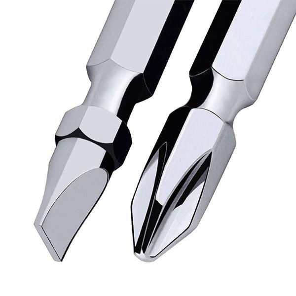سری پیچگوشتی کد JVT00S2OH2 : سری پیچگوشتیها در اشکال مختلفی همچون چهارسو، دوسو، ستارهای و ... تولید میشوند. از این ابزارها در دریل پیچگوشتیهای شارژی و برقی و پیچگوشتیهای دستی استفاده میشود. سریهای پیچگوشتی با توجه به نوع کاربردشان، دایما در برابر فشار، پیچش و ضربه قرار دارند، درنتیجه کیفیت ساخت آنها اهمیت بسیار زیادی دارد. دراینبین شرکتهای زیادی در تولید ابزارهای دستی و برقی فعالیت میکنند. شرکت آمریکا نیز در این زمینه فعالیتهای زیادی داشته است و محصولاتش را با قیمت و کیفیتی مناسب عرضه میکند. سری پیچ گوشتی آمریکا S2_PH2 محصولی باکیفیت محسوب میشود. این سری دارای یک سر چهارسو با سایز PH2 و یک سر دوسو با سایز SL6 است ، از این رو می توان از این سری برای باز و بسته کردن پیچ های دوسو و چهارسو در این دو سایز استفاده کرد. از این سری در پیچ گوشتی های شارژی، برقی، دریل پیچ گوشتی ها و برخی پیچ گوشتی های دستی با سر تعویض شونده استفاده می گردد. این سری پیچ گوشتی ضریب سختی برابر HRC 60 دارد. آلیاژ به کار رفته در این سری، کروم وانادیوم است که در برابر فشار، ضربه وحرکات پیچشی مقاومت بالایی دارد. از نکات قابل توجه دیگر که باعث بالا رفتن میزان مقاومت این سری پیچگوشتی شده، استفاده از روکش الکتروپلیت و پلیش شده با لایه ای ضد زنگ در ساخت آن است. این سری مطابق با استاندارد DIN 3126 تراشکاری شده که نشان دهندهی دقت و ظرافت آن در نوع تراش است.