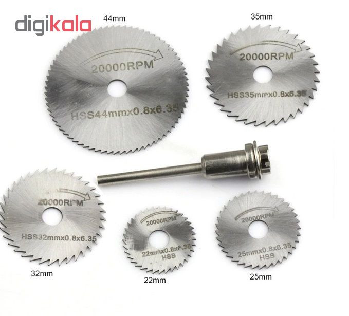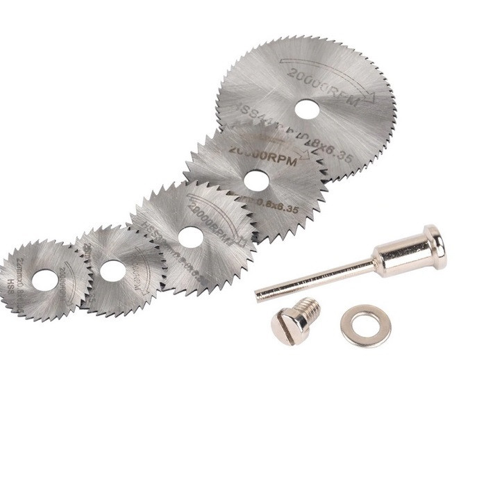 از تیغه های HSS برای برش انواع چوب ، پلاستیک و فلزات نرم و در حجم کم استفاده می شود . مجموعه فوق از 5 تیغه و یک شفت تشکیل شده است که از تیغه های بزرگتر برای برش چوب و از تیغه های کوچکتر برای برش فلزات نرم می توان استفاده کرد . از این مجموعه عمدتا برای فرزهای حکاکی مینیاتوری استفاده می شود . ذکر این نکته ضروری است که این مجموعه برای کارهای ظریف مناسب بوده و نمی توان انتظار برش در حجم و ضخامت بالا را از آن داشت . به دلیل کیفیت ساخت بالاتر نسبت به نمونه های مشابه این ابزار توانسته است مجوز واردات به کشور کانادا را کسب کند . برای کار با این تیغه ها استفاده از عینک ایمنی توصیه می شود . تنظیم دور دستگاه با توجه به جنس کار و میزان پیشروی متغیر می باشد .