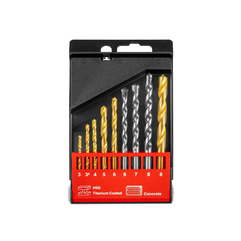 توضیحات مجموعه : سایز مته آهن:5/3 , 8/6/5/4/3 میلیمتر و سایز مته الماسه بتن : 8/7/6 میلیمتر