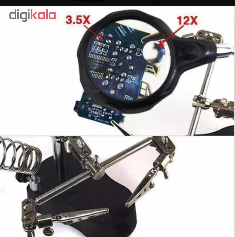 این کالا نوعی گیره و پایه هویه مجهز به ذره بین با قدرت بزرگ نمایی 12x و 3.5x میباشد که دارای 2 عدد ال ای دی جهت روشن کردن سطح کار و هم چنین گیره های متحرک جهت نگهداره برد های الکترونیک.است