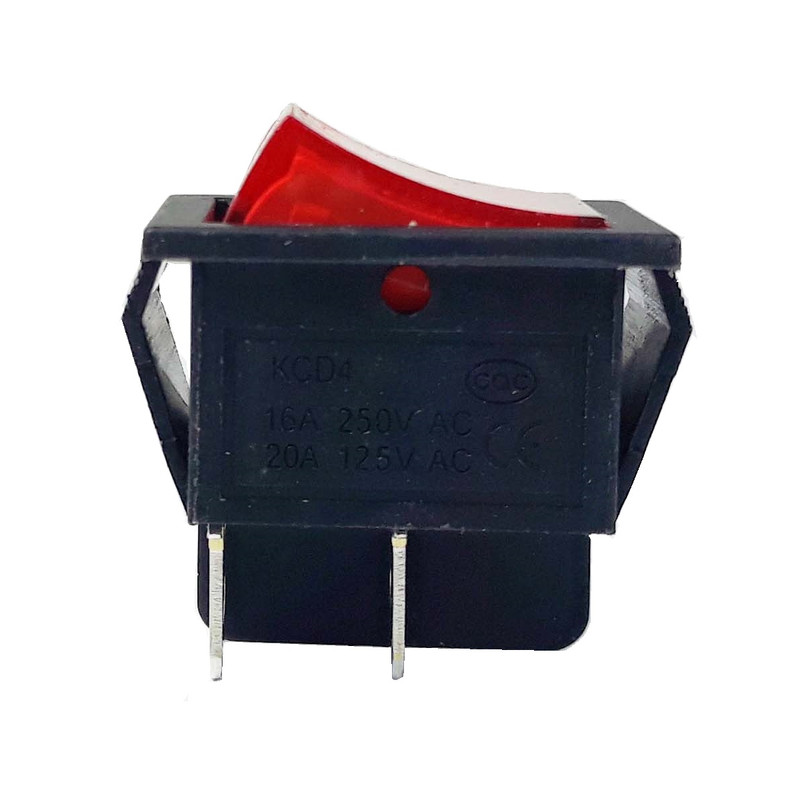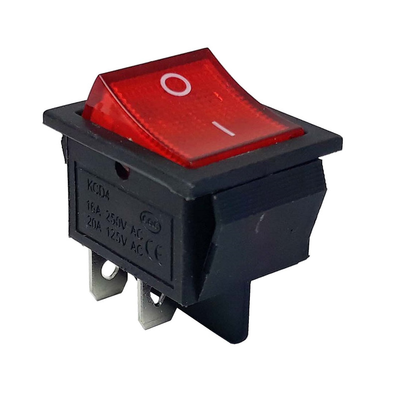 کلیدهای چراغ دار علاوه بر قطع و وصل ، برای تعیین وضعیت روشن و خاموش بودن کلید نیز کاربرد دارند.کلید چراغ دار راکر مدل 4PIN-996 دارای چهار پین بوده و هر دو ورودی فاز و نول به کلید را قطع و وصل می کند . کلید حداکثر برای جریان 16 آمپر در ولتاژ 250 ولت طراحی شده است که معادل توان 4000 وات می باشد . حفره محل قرار گیری کلید به شکل مستطیل بوده و ابعاد آن 18.5 در 28.5 میلیمتر می باشد.در دو سمت کلید خار وجود دارد که باعث تثبیت در محل قرار گیری می شود. برای اتصال سیم به 4 پین کلید از سر سیم کتابی ( فیش موسوم به کتابی ) استفاده می شود .