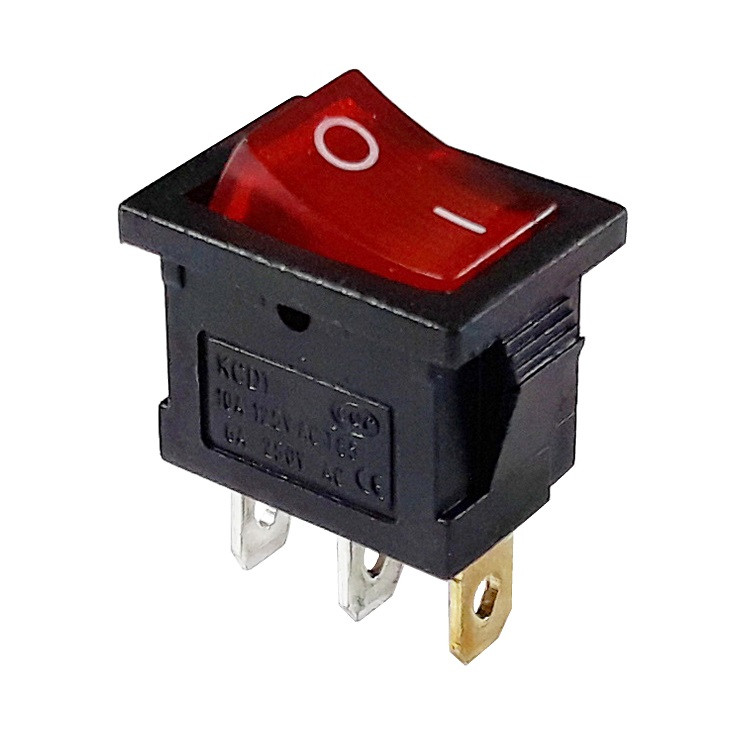 کلیدهای چراغ دار علاوه بر قطع و وصل ، برای تعیین و تشخیص وضعیت روشن و خاموش کلید نیز کاربرد دارند.کلید چراغ دار راکر مدل 3P-2015 دارای 3 پین بوده و که دو پین برای اتصال در مسیر قطع و وصل و دیگری برای اتصال نول به کلید برای روشن شدن چراغ کلید در وضعیت اتصال بسته ، می باشد. کلید حداکثر برای جریان 6 آمپر در ولتاژ 240 ولت AC و یا 10 آمپر در ولتاژ 125 ولت AC طراحی شده است .حفره محل قرار گیری کلید به شکل مستطیل بوده و ابعاد آن 13.5 در 19 میلیمتر می باشد.در دو سمت کلید خار وجود دارد که باعث تثبیت در محل قرار گیری می شود.