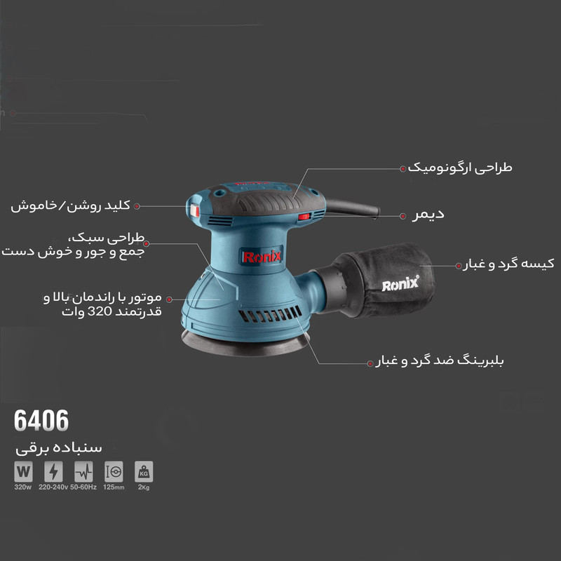 سنباده لرزان 320 وات دیمردار 6406 از طراحی ارگونومیک و وزن سبکی بهره مند است که قابلیت استفاده با یک دست را برای کاربر فراهم می سازد. همچنین برای این دستگاه دسته ای با روکش لاستیکی در نظر گرفته شده که باعث افزایش کنترل کاربر بر روی دستگاه و نیز کاهش خستگی در هنگام کار می شود. از دیگر امکانات این محصول سوئیچ ضد گرد و غبار با روکش پلاستیکی است که با جلوگیری از ورود گرد و غبار به افزایش طول عمر دستگاه کمک می کند. مدل 6406 به همراه کیسه جمع آوری گرد و غبار، یک جفت ذغال و کاغذ سنباده در جعبه طراحی شده توسط رونیکس عرضه می شود.