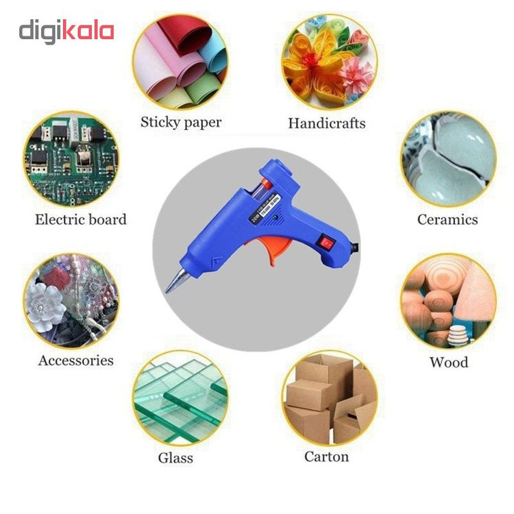 برای چسباندن کاغذ، چوب، مقوا، شیشه، سرامیک، سنگ، پلاستیک، پارچه و فلزات چسب حرارتی یکی از بهترین گزینهها است. چسبهای حرارتی هم بدون رنگ بوده و هم باعث اتصال قوی بین قسمتهای مختلف میشود و به این علت از آنها میتوان در ساخت کاردستی و کارهای تزییناتی استفاده نمود. همچنین از این ابزار میتوان برای آببندی برخی سطوح نیز استفاده کرد. توان این تفنگ ۲۰ وات بوده و دمای تولیدی برای ذوب کردن چسب ۲۰۰ درجه سانتیگـراد است. این نوع چسب حراراتی دارای نشانگر وضعیت، کلید برای خاموش و روشن کردن و گیره برای ایستادن میباشد.