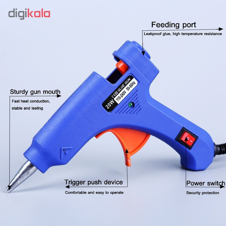 دارای کلید خاموش و روشن کردن مناسب برای کارهای خانگی و نیمهحرفهای قابلیت چسباندن چوب، پلاستیک، شیشه، کاغذ و سرامیک بدون نشتی در حالت عدم استفاده مصرف کم