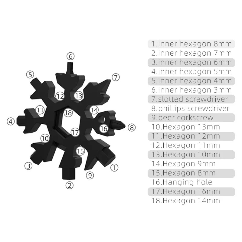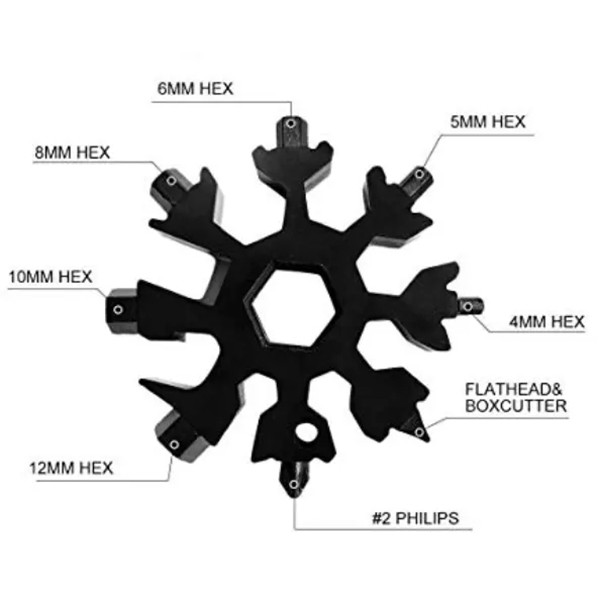 ابزار چندکاره دانه برفی HARMEN دارای 18 نوع کارایی است که می تواند نیازهای مختلف روزمره ما را برآورده کند.ابزار چند منظوره را نه تنها می توان در بسیاری از شرایط استفاده کرد، بلکه با طراحی دانه برفی خود می تواند یک لوازم تزئینی منحصر به فرد باشد. اما بیشتر یک ابزار کاربردی، نوعی گجت نیز به حساب می آید که می توان از آن برای محکم کردن یا باز کردن پیچ و مهره وسایل منزل، دوچرخه و حتی برای باز کردن درب بطری استفاده کرد. ابزار همه کاره دانه برفی 18 در 1 از فولاد ضد زنگ ساخته شده است که نه تنها ضد آب بلکه در برابر خوردگی نیز مقاوم است.