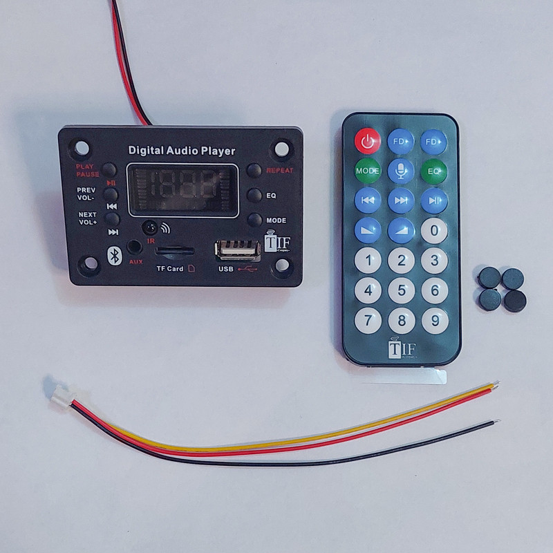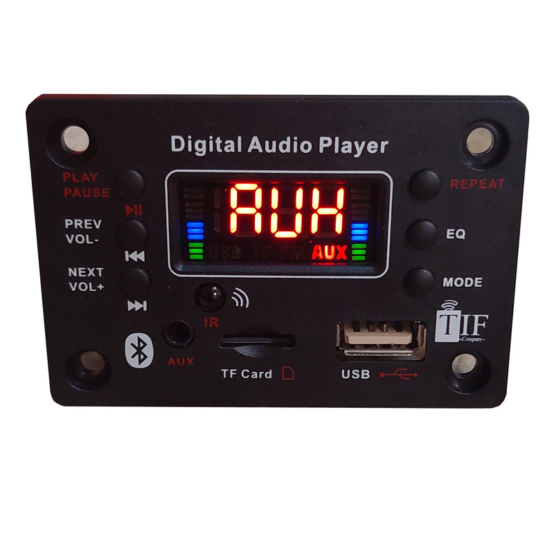 شما می توانید با کمک این ماژول به آسانی دستگاه قدیمی صوتی را به یک پخش کننده جدید و به روز تبدیل کنید. برد tif company فلش خور یا ماژول MP3 پلیر بلوتوث دار مدل بهینه شده ( دارای دیود جهت محافظت در برابر اتصال معکوس قطب + و - ) دارای خروجی صدای استریو به صورت 3 سیم کانال چپ، کانال راست و وسط مشترک، دارای ریموت کنترل از راه دور، ورودی مادگی AUX، پورت مادگی USB، رادیو FM، گیرنده بلوتوث صدا از موبایل، تبلت، لپتاپ، کارت حافظه TF توسط این برد میتوان انواع پخش ، اسپیکر ، آمپلی فایر ، ضبط خودرو و... را مجهز به بلوتوث و usb کرد ولتاژ ورودی ماژول 6V DC تا 12V DC است. این برق میتواند از طریق باتری، آداپتور 5 ولت 1 آمپر یا برق خودرو تامین شود. این محصول از محصولات مشابه کیفیت بالاتری دارد و صفحه نمایش دارای رقص نور میباشد همچنین قابلیت رکورد فایل صوتی در حال پخش را نیز دارد.