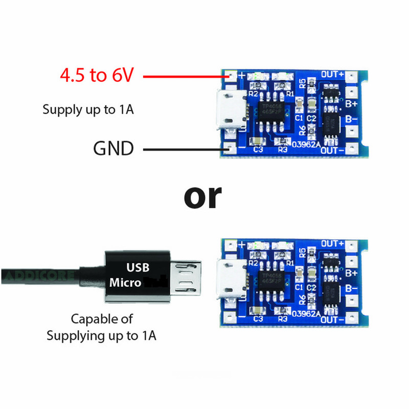 ماژول شارژر باتری لیتیومی TC4056/TP4056 یک ماژول کاربردی برای شارژ و دشارژ باتری های لیتیومی است . بوسیله این ماژول میتوان یک باتری تک سلول لیتیومی 3.7 ولت مانند 18650 که مدار محافظ داخلی ندارد را و با حفاظت کامل شارژ کرد و همچنین دشارژ باتری را نیز کنترل کرد . یک باتری لیتیومی باید به گونه ای شارژ شود که با رسیدن ولتاژ به 4.2 ولت جریان شارژ قطع شود همچنین دشارژ آن باید به گونه ای باشد که که با رسیدن ولتاژ باتری به 2.4 ولت دیگر باتری دشارژ نشود . در غیر این صورت عمر باتری کم شده و باتری آسیب میبیند . در طراحی این ماژول از آی سی شارژ TC4056 و یا TP4056 و آی سی حفاظت DW01 استفاده شده که باعث میشود باتری لیتیومی با حفاظت کامل و بدون خطر شارژ و دشارژ شود . به این صورت که آی سی DW01 جریان شارژ را توسط ماسفت 8205A بر روی یک آمپر تنظیم می کند و بعد از شارژ کامل یعنی رسیدن ولتاژ باتری به 4.2 ولت عملیات شارژ را قطع می کند. همچنین در زمان دشارژ باتری با رسیدن ولتاژ باتری به 2.4 ولت جریان بار توسط آی سی DW01 قطع میشود تا ولتاژ باتری به کمتر از 2.4 ولت نرسد . در صورتی که ولتاژ باتری وصل شده به ماژول کمتر از 2.9 ولت باشد ماژول شارژ را با جریانی در حدود 130 میلی آمپر آغاز تا زمانی که ولتاژ باتری به 2.9 ولت برسد سپس جریان شارژ به صورت خطی افزایش می یابد . برای استفاده از این ماژول در ابتدا تغذیه 5 ولت ماژول را تامین کنید ، این کار از دو طریق امکان پذیر است ، یا از طریق پورت میکرو USB TYPE C اندرویدی روی ماژول و یا از طریق دو پد دو طرف پورت که با مثبت و منفی مشخص شده اند . منبع تغذیه باید به گونه ای انتخاب شود که حداقل بتواند یک آمپر خروجی داشته باشد . مثبت و منفی باتری را با دقت به دو پدی که با B+ و B- مشخص شده اند متصل کنید . (دقت شود که به درستی متصل شود در غیر این صورت ماژول آسیب میبیند) مصرف کننده ( اسباب بازی ، لامپ و .. ) باید به دو پد OUT+ و OUT- وصل شود و اگر مصرف کنند مستقیم به باتری وصل شود حفاظت در برابر دشارژ بیش از حد انجام نمی شود . لازم به ذکر است که در زمان شارژ باتری نباید مصرف کننده به ماژول متصل شود در زمان شارژ ال ای دی قرمز رنگ روشن می شود و هنگام شارژ کامل ال ای دی سبز روشن می شود .