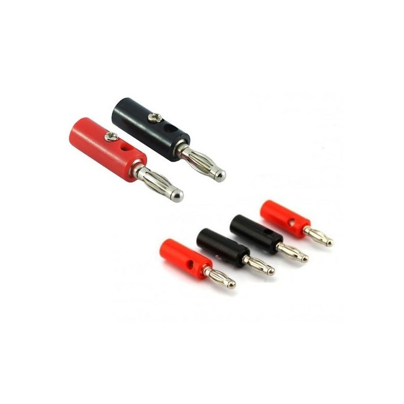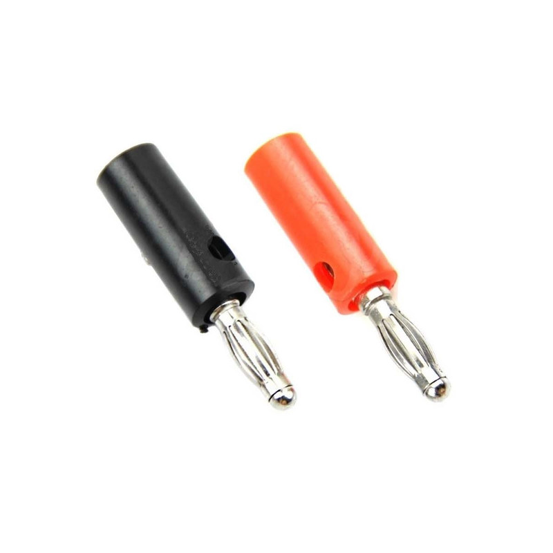 فیش موزی نری، جفت فیش به رنگ قرمز و مشکی، مناسب جهت اتصال به فیش مادگی موزی انواع منبع تغذیه، مولتی متر ، تجهیزات آزمایشگاهی، تجهیزات صنعتی، انواع سیم رابط، پراب. دارای ترمینال پیچی جهت اتصال سیم بدون نیاز به لحیمکاری و از طریق پیچ موجود روی بدنه بخش فلزی فیش موزی نری. 2 عدد فیش موزی نری به رنگ قرمز جهت قطب مثبت و سیاه جهت قطب منفی است.