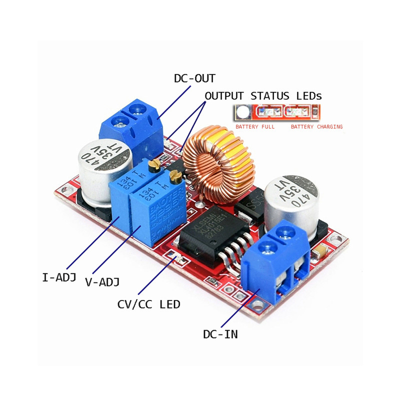 همچنین، 3 عدد چراغ ال ای دی روی این برد قرار دارد که وضعیت های آماده به کار، در حال کار (عبور جریان) و محدود کنندهی جریان (عبور حداکثر جریان تنظیم شده) را نشان میدهند. به عنوان مثال، اگر به عنوان شارژر باتری در حال استفاده باشد و چراغ در حال کار خاموش شده و آماده به کار روشن شود، نشان دهندهی پر شدن باتری ها و اتمام شارژ است.