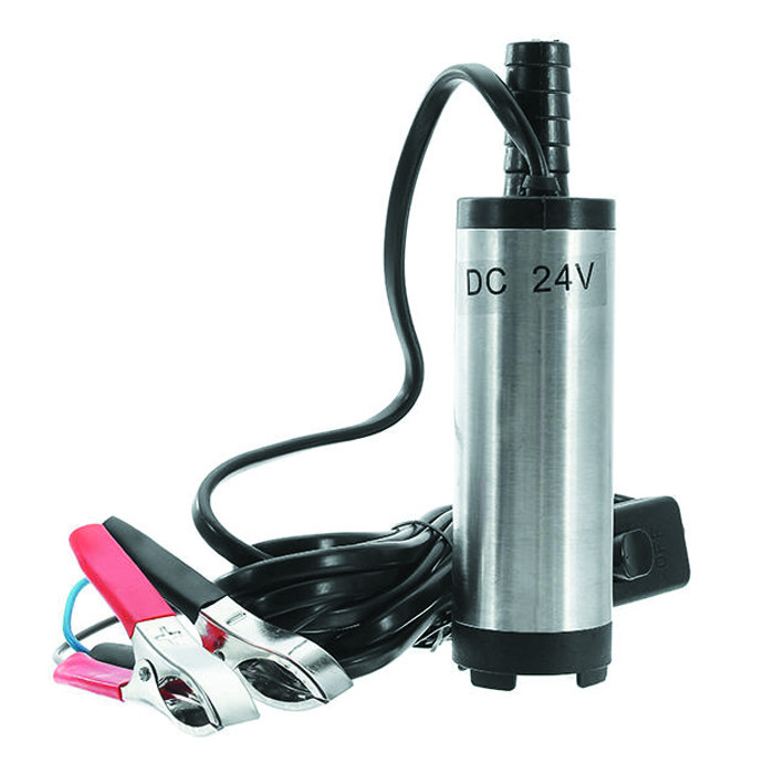پمپ گازوئیل کش با برق 24 ولت (برق باطری خودرو ها سنگین ) کار می کند. این پمپ میتواند از داخل مخزن یا باک ماشین آلات (بنزین ، گازوییل، روغن، کروزنو، پارافین، روغن هیدرولیک و سایر روغن ها تا 15 سانتیمتر) سوخت کشی انجام دهد. این پمپ ها می توانند از ارتفاع 5 متری مکش کرده و با قدرت بسیار بالا تا 10 متر ارتفاع سوخت رسانی انجام دهد.از ویژگی های مهم این پمپ ها سرعت سوخت کشی است. در واقع به علت نیروی خوب موتور این پمپ ها، به راحتی می توان انتقال را انجام داد. در واقع به علت نیروی بالای موتور پمپ گازوئیل کش برقی ماشین آلات راهسازی، به راحتی می توان انتقال را انجام داد.پمپ تخلیه گازوئیل دارای انبرهای سوسماری شکل برای اتصال به برق باطری می باشد و دارای کلید روشن خاموش میباشد