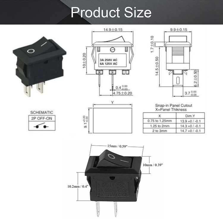 قابلیت ها : کلید راکر 2 پایه مینی (کوچک/ریز) مشکی بسته 20 عددی ابعاد حفره 13.5 در 8.5 میلی متر 250 وات 3 آمپر 125 وات 6 آمپر