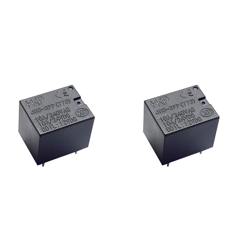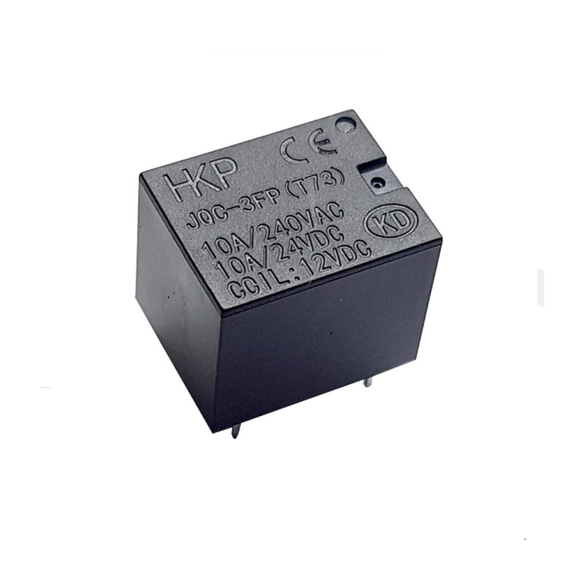 رله HKP که دارای سیم پیچ تحریک 12 ولت dc و حد خروجی 10 امپری در 240 ولت ac و 24 ولت dc میباشد دارای کد استاندار jqc-3fp ( T73 ) می باشد پایه های این رله سایز استاندارد میلون میباشند این رله دارای 5 پایه میباشد که در قسمت بالا دارای 3 پایه است که پایه وسط برق مشترک و دو طرف برای تحریک رله به کار میروند و دو پایه قسمت پایین وقتی جهت پایه ها به سمت خودمان است پایه سمت راست اتصال باز no و پایه سمت چپ اتصال بسته nc می باشند.