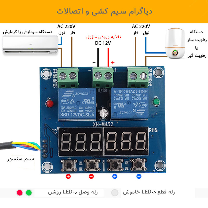 این ماژول جهت اندازه گیری ، نمایش و کنترل میزان دما و رطوبت یک محفظه طراحی و تولید گردیده که برای کنترل انواع تجهیزات مانند دستگاه های جوجه کشی ، گلخانه های کوچک و اتاقک های پرورش قارچ ، تابلو فرمان برق و plc ، کابینت اینورتر و باتری ، انکوباتورهای کشاورزی ، ماشین آلات چاپ ، یخچال و فریزر ، سردخانه ، کنترلر دما و رطوبت محفظه ATM و ... به کار می رود. با توجه به ویژگی ها و قیمت یکی از بهترین های بازار بوده و با تنظیمات بسیار ساده براحتی آماده برای استفاده خواهد بود. ماژول در 4 مد سرمایشی ، گرمایشی ، رطوبت ساز ، رطوبت گیر قابل تنظیم می باشد.