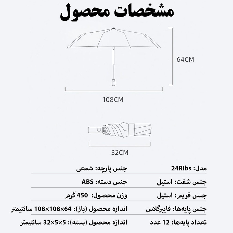 چتر مدل 24Ribs با داشتن اسکلتی از جنس استیل و 12 پایه دوبل، نمادی شایسته از استحکام و دوام است. جنس ستون و فریم این چتر تماما استیل بوده و متشکل از 12 پایه دوبل (24 پایه) از جنس فایبرگلاس تقویت شده با فنرهای از جنس استیل است که آن را در مقابل شدیدترین بادها نیز مقاوم میکند. پارچه این چتر از نوع شمعی است که در قسمت داخلی آن روکشی از جنس Vinyl قرار گرفته و آن را تماما ضدآب میکند. ستون این چتر از نوع تلسکوپی بوده و در حالت بسته ابعاد چتر بسیار است و قابلیت حمل بسیار خوبی دارد. قطر چتر در حالت باز، 105 سانتیمتر است و به راحتی برای 2 نفر پوشش دهی دارد. باز و بسته شدن چتر به صورت تمام اتوماتیک است. دسته چتر از جنس ABS با روکش ضدلغزش است. همچنین یک بند روی دسته چتر برای حمل و نقل راحت تر تعبیه شده است.