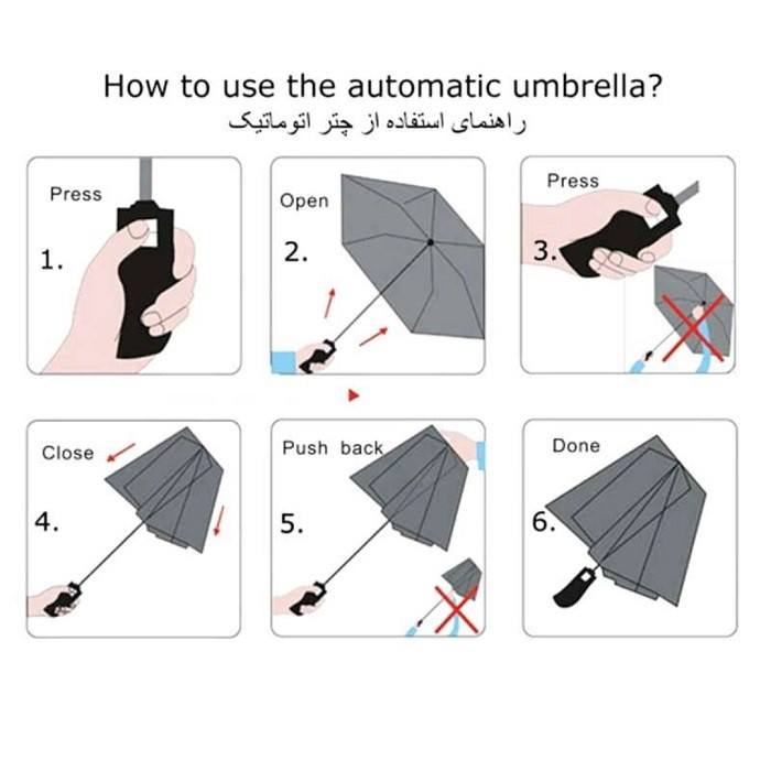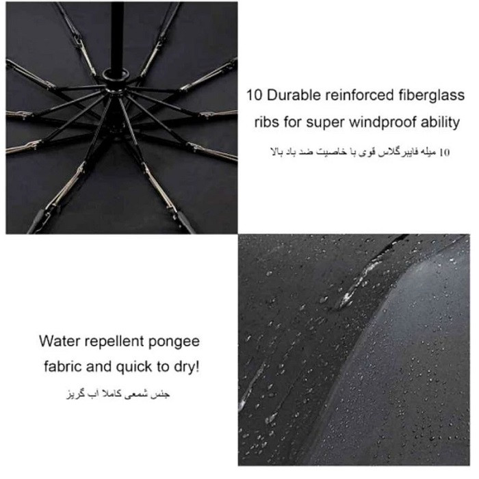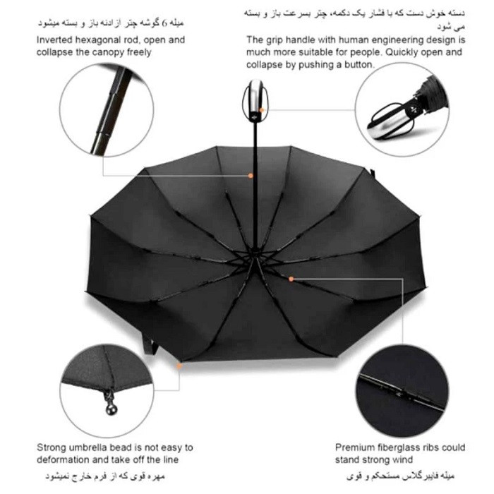 دسته نقره ای - Windproof2025 چتر فول اتوماتیک (ضد باد) ، این چتر از معدود چترهای است که از فنر مستحکم فایبرگلاس ضد باد برخوردار است همچنین هر کدام از این فنرها با یک فنر 6 سانتی کوچک تقویت شده اند این خاصیت باعث میشود که چتر در مقابل شدیدترین وزش بادها ایستادگی کند و نشکند ، پارچه چتر از جنش شمعی 100درصد آب گریز است که به هیچ عنوان خیس نمیشود ، چتر دارای کاور مخصوص است و در حالت بسته تنها 32.5 سانتی متر طول دارد که حمل آن را بسیار راحت و اسان میکند ، جنس دسته از پلاستیک باکیفیت با روکش ضد لغزش است و دارای بند مخصوص کشی میباشد ، چتر حالت 3تاشو دارد و با یک دکمه باز و بسته میشود و فقط تاکردن ان بصورت دستی میباشد.