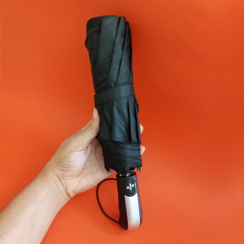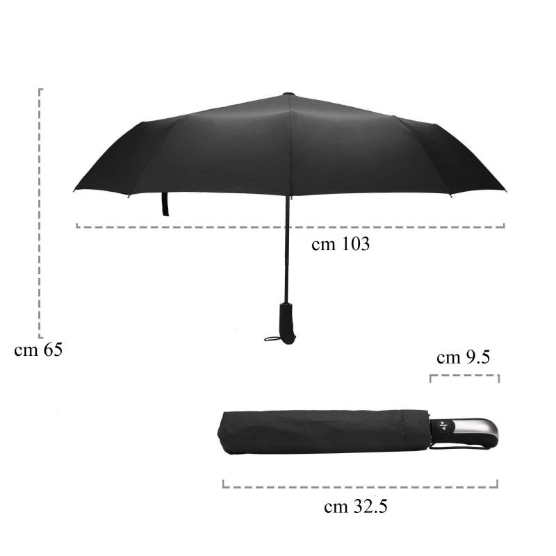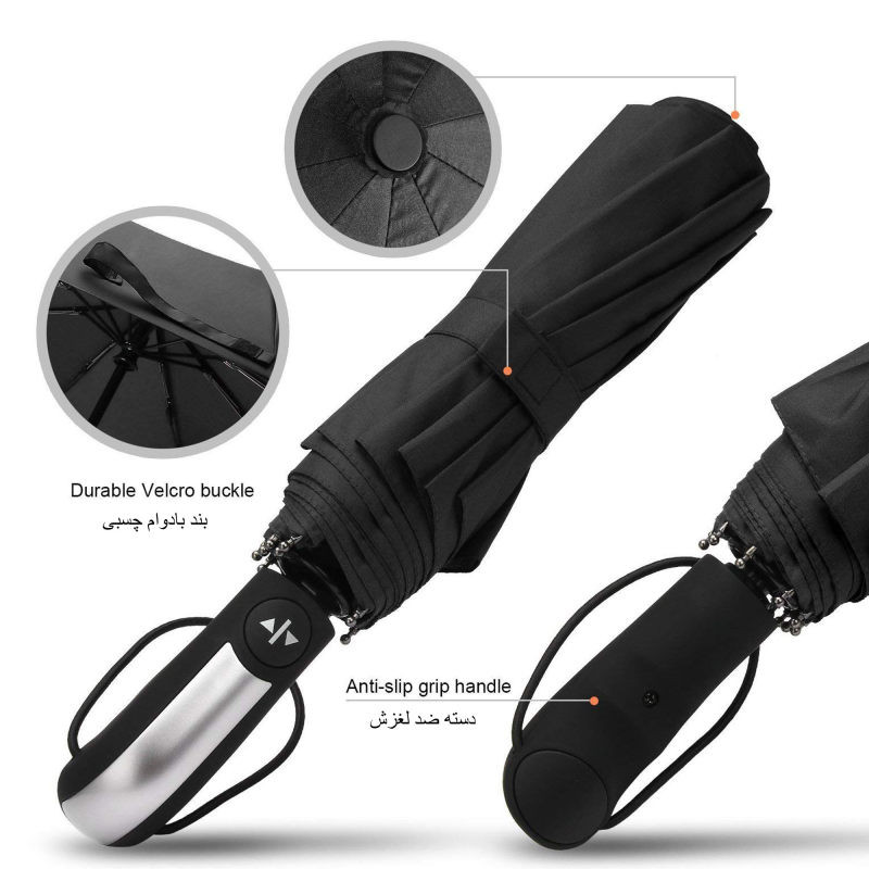 چتر فول اتوماتیک 10 فنر ویندپروف Windproof (ضد باد) ، این چتر از معدود چترهای است که از 10 فنر مستحکم فایبرگلاس ضد باد برخوردار است همچنین هر کدام از این فنرها با یک فنر 6 سانتی کوچک تقویت شده اند این خاصیت باعث میشود که چتر در مقابل شدیدترین وزش بادها ایستادگی کند و نشکند ، پارچه چتر از جنش شمعی 100درصد آب گریز است که به هیچ عنوان خیس نمیشود ، چتر دارای کاور مخصوص است و در حالت بسته تنها 32.5 سانتی متر طول دارد که حمل آن را بسیار راحت و اسان میکند ، جنس دسته از پلاستیک باکیفیت با روکش ضد لغزش است و دارای بند مخصوص کشی میباشد ، چتر حالت 3تاشو دارد و با یک دکمه باز و بسته میشود و فقط تاکردن ان بصورت دستی میباشد.