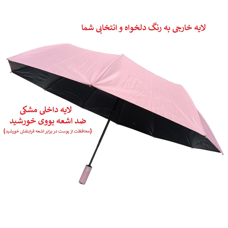 سایر توضیحات : باز و بسته شدن چتر بصورت تمام اتوماتیک، 10 فنر، بند چسبی بادوام، پارچه دو لایه (لایه داخلی ضد اشعه یووی خورشید و همواره به رنگ مشکی)