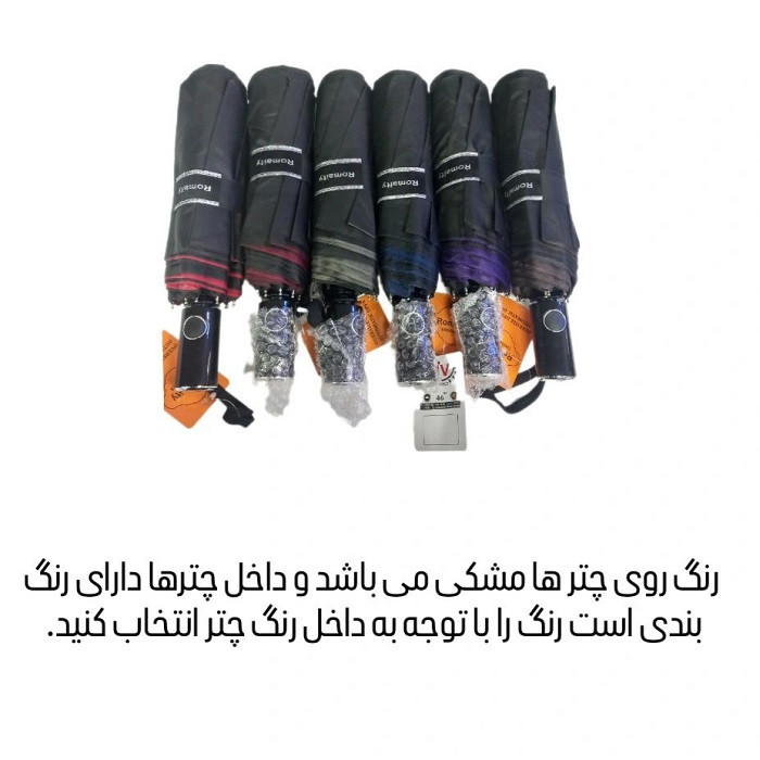این مدل چتر Romaity33 در مقابل شدیدترین وزش بادها میتواند ایستادگی کند و نشکند ، پارچه چتر از جنش شمعی 100درصد آب گریز است که به هیچ عنوان خیس نمیشود ، چتر دارای کاور مخصوص است و در حالت بسته تنها 30 سانتی متر طول دارد که حمل آن را بسیار راحت و اسان میکند .