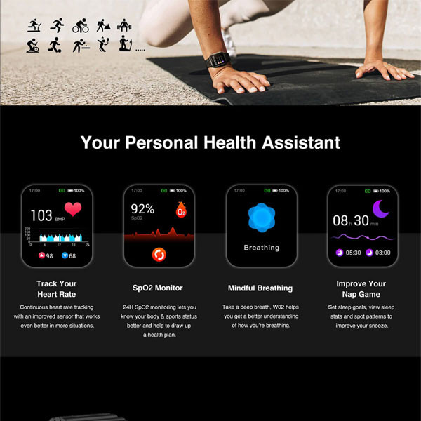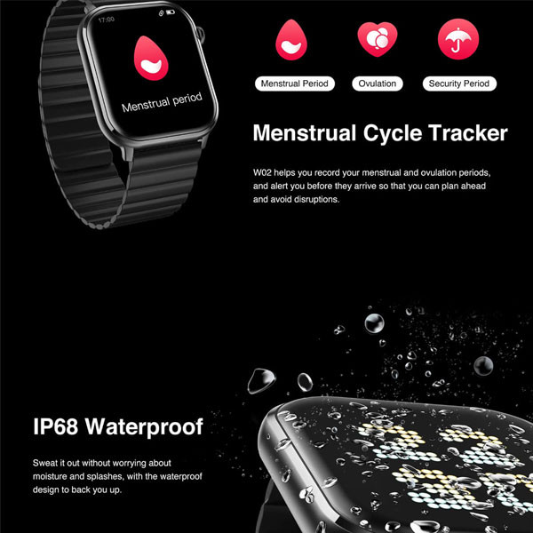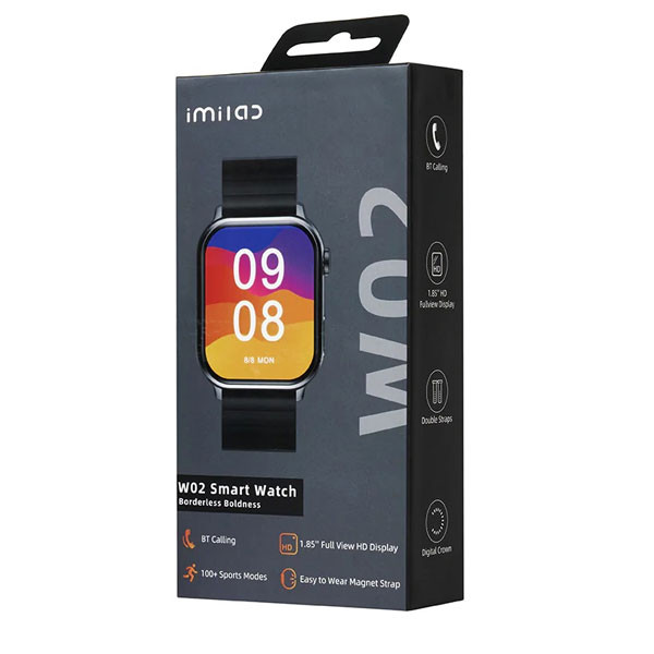 همچنین یک بند 22 میلی متری مگنتی با کیفیت نیز روی این ساعت قرار گرفته است؛ یک بند سرمهای سیلیکونی نیز در بسته بندی ساعت وجود دارد. در هنگامی که ساعت را با بلوتوث به موبایل خود وصل کرده باشید، قادر خواهید بود که با IMILAB W02 به تماس تلفنی خود پاسخ دهید یا به انجام تماس تلفنی بپردازید. این ساعت یک صفحه نمایش 1.85 اینچی با رزولوشن 280 × 240 داشته که کیفیت بسیار بالایی را در اختیار شما قرار میدهد. روی صفحه از لایه محافظ شیشهای منحنی که بصورت 2.5D طراحی شده، پوشانده شده است. شرکت آی می لب واچ فیس های مختلفی را برای این ساعت معرفی کرده است. همچنین شما می توانید عکس خودتان را در پس زمینه ساعت قرار داده و یا میتوانید این واچ فیسها را بنا به سلیقه خود شخصی سازی کنید. این ساعت دارای قابلیت ردیابی 100 نوع حالت ورزشی مختلف را دارد که شامل دویدن، دوچرخه سواری، بدمینتون، تنیس، تنیس روی میز، کریکت، طناب زدن، بسکتبال، والیبال، بیسبال، راگبی، هاکی، رقص، یوگا، اسب سواری، اسکی فضایی، ورزشهای رزمی، تردمیل، دوچرخه ثابت، پیاده روی، نرمش و ... میشود که همگی به دقیق ترین حالت ممکن توسط ساعت جمع آوری شده و در اپلیکیشن نیز بصورت دقیقتر قابل مشاهده است. این ساعت دارای استاندارد مقاومت در برابر آب IP68 است که به معنای مقاوم بودن ساعت برابر آب و گرد و غبار است. اندازهگیری سطح اکسیژن خون، پایش کیفیت خواب، اندازهگیری سطح استرس، یادآوری دوره قاعدگی زنان، پایش 24 ساعته ضربان قلب از قابلییت های سلامتی این ساعت است. ساعت IMILAB W02 می تواند اس ام اس ها، تماس ها، زنگ آلارم، آب و هوا و سایر اطلاعات برنامه های اجتماعی را به موقع به شما یادآوری کند. همچنین با استفاده از این ساعت میتوانید موسیقی که روی گوشی تان پخش میشود را کنترل کنید. اپلیکیشن این ساعت GloryFit است و به راحتی از اپ استور و پلی استور قابل دانلود میباشد.