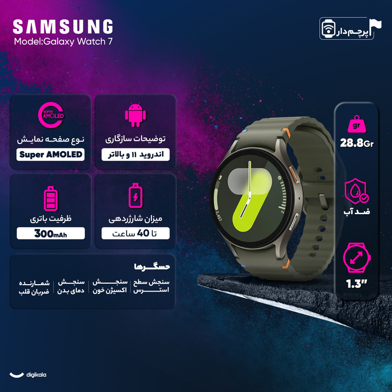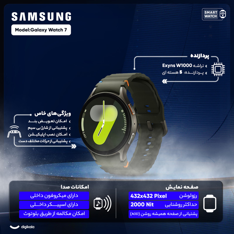 ساعت هوشمند سامسونگ مدل Galaxy Watch 7، یک انتخاب عالی برای افرادی است که به دنبال ساعت هوشمندی با طراحی زیبا و ویژگیهای پیشرفته هستند. این ساعت با ابعاد 40.4x40.4 میلیمتر و وزن سبک 28.8 گرم، راحتی زیادی را هنگام استفاده فراهم میآورد. بدنه آن از آلومینیوم ساختهشده است و شیشه یاقوتی آن مقاومت بالایی در برابر خطوخش دارد. بند آن قابلیت تعویض داشته و بهراحتی میتوان آن را باسلیقههای مختلف هماهنگ کرد. صفحهنمایش Super AMOLED این ساعت با اندازه 1.5 اینچ و رزولوشن 432x432 پیکسل، تصاویری واضح و رنگهای زندهای را نمایش میدهد. ویژگی Always On Display و روشنایی 2000 نیت، امکان مشاهده آسان اطلاعات حتی در زیر نور مستقیم خورشید را فراهم میکند. این ساعت هوشمند با سیستمعامل WearOS 5 و پردازنده Exynos W1000 پنج هستهای عملکردی سریع و روان دارد و برای کاربران اندروید نسخه 10 و بالاتر سازگار است. Galaxy Watch 7 مجهز به حسگرهای متعددی مانند سنجش ضربان قلب، اکسیژن خون، فشارسنج، قطبنما، ارتفاعسنج و ژیروسکوپ است که به شما کمک میکند تا سلامت خود را به طور دقیق رصد کنید. همچنین، این ساعت از GPS برای مکانیابی دقیق و پایش وضعیت خواب و سلامت بانوان پشتیبانی میکند. باتری 300 میلیآمپر ساعتی آن باقابلیت شارژ بیسیم، عمر طولانی را در اختیار شما قرار میدهد. با گواهی IP68 و مقاومت در برابر آب تا عمق 50 متر، این ساعت برای استفاده در شرایط مختلف، ازجمله ورزشهای آبی، مناسب است.