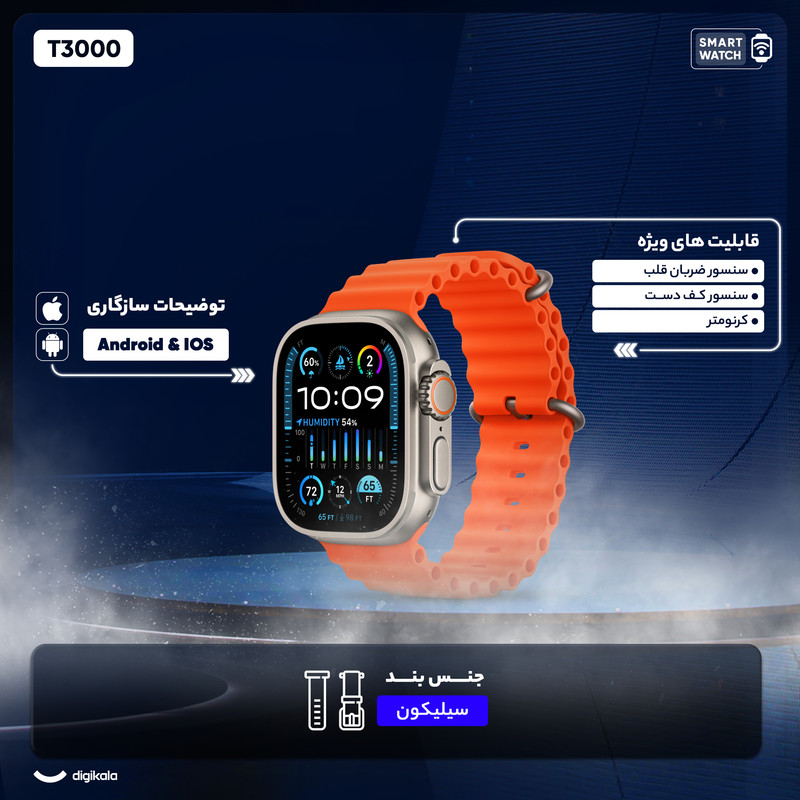 ساعت T3000 با بالاترین کیفیت درمیان ساعت های هم رده ی خود در این بازه قیمتی میباشد . از ویژگی های این ساعت میتوان به : سازگار بودن اندروید و ios ، شارژر وایرلس ، سنسور ضربان قلب ، سنسور کف دست ، ماشین حساب کرنومتر ، بازی ، میباشد .